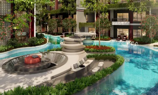 22 outdoor facilities such as feature art walls, multiple pool areas (lap pool, social pool, jacuzzi, kids pool, pet pool), garden walk, relaxing terraces, water features and playgrounds including a sculptural playground and pet playground.