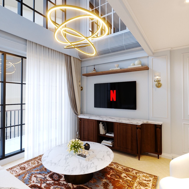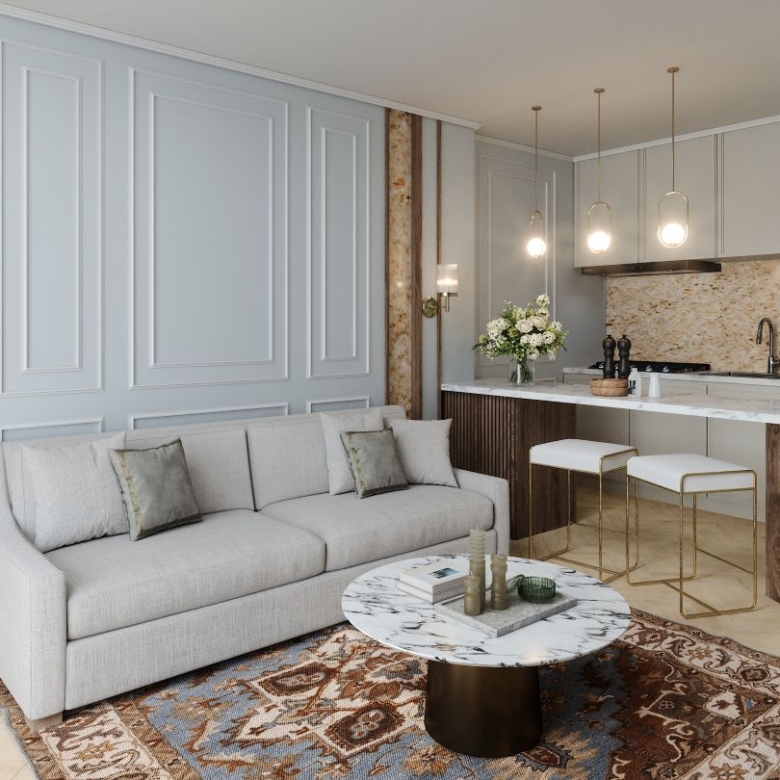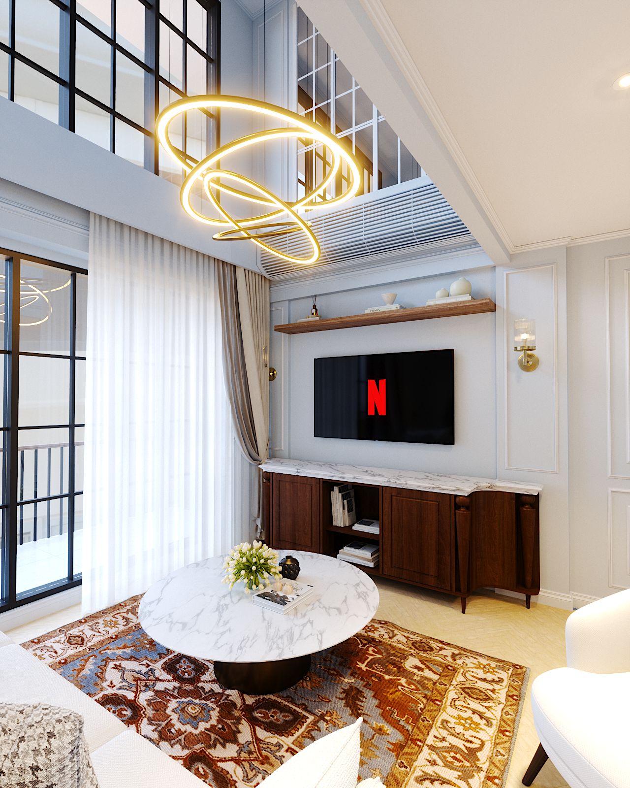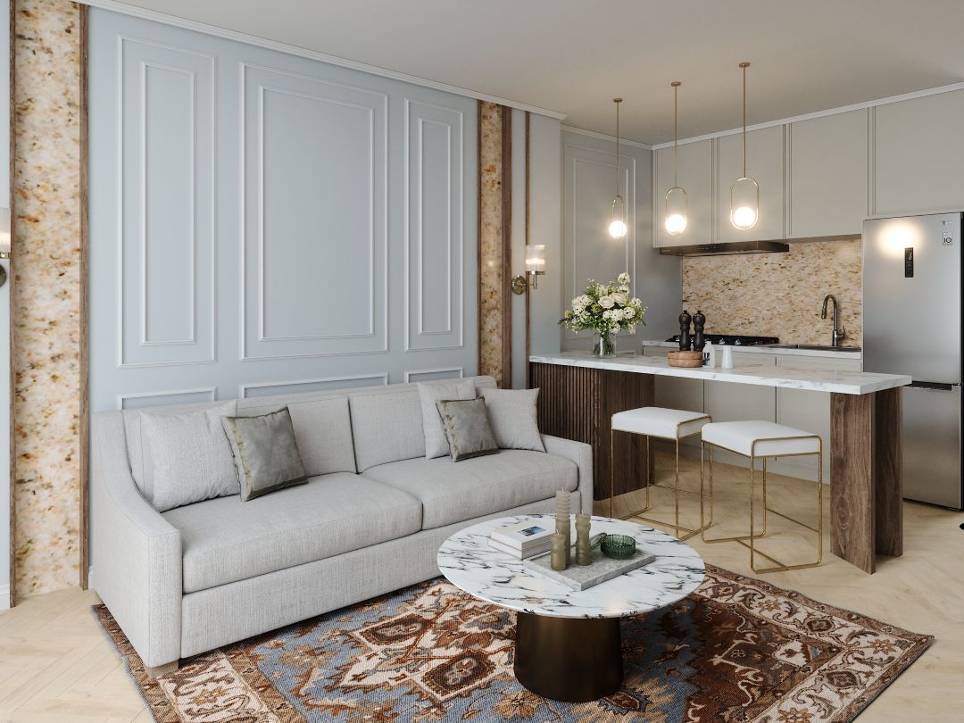 Spacious open-plan living area with high ceilings and natural light