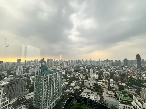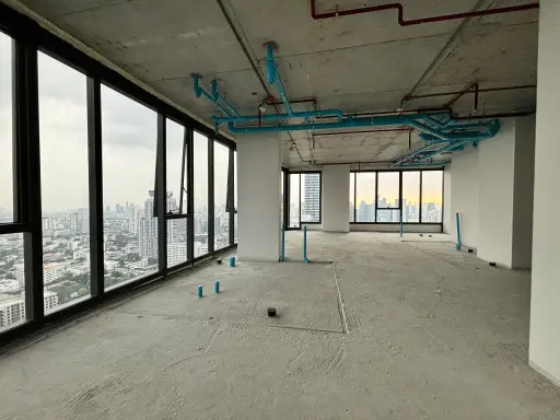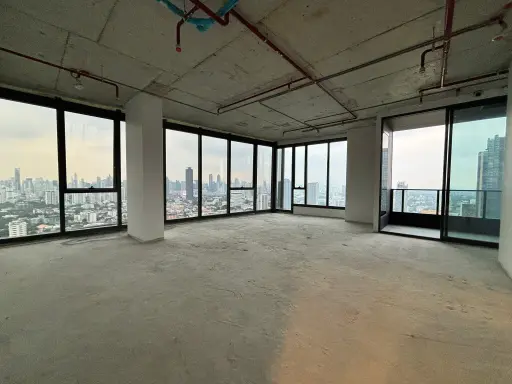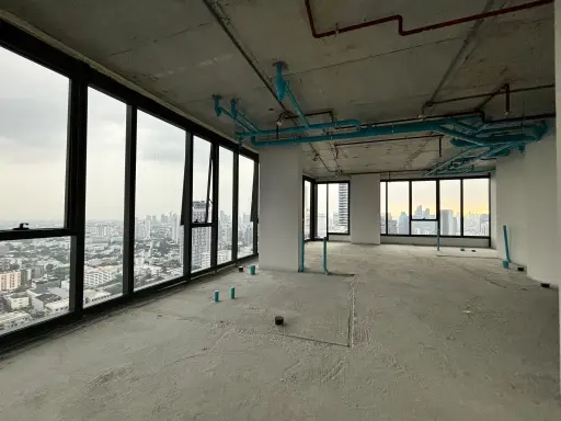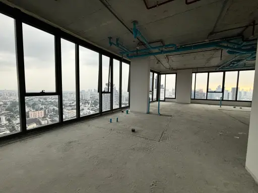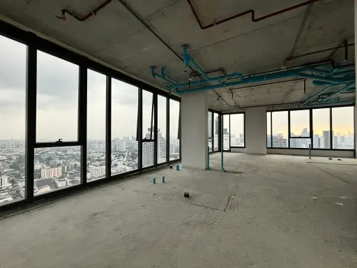 This is a pretty unique find—a high-rise corner unit with floor-to-ceiling windows on two sides, so you get amazing natural light and unobstructed city views all day. At 156 square meters, the layout is open and flexible, but the interior is still in a bare-shell condition. You’ve got this cool industrial vibe with unfinished concrete floors, exposed ceilings showing pipes, ducts, and wiring, and vertical support columns right inside the space.