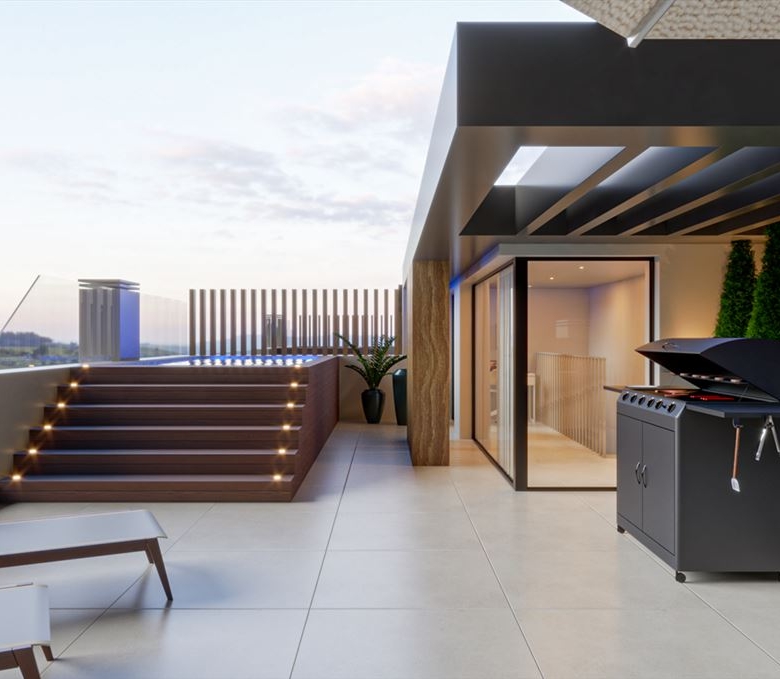 As an added benefit, all apartments come with their own parking space in the underground garage, as well as access to the large rooftop terrace, which offers communal swimming pools, Jacuzzi, BBQ, and uninterrupted ocean views, perfect for relaxation and entertaining guests.
