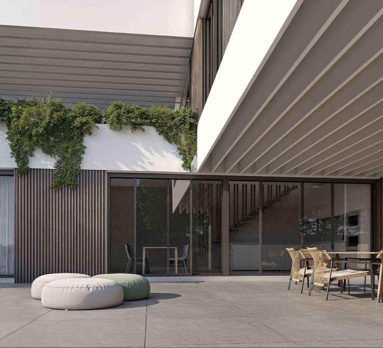 – Sustainable design with natural stone and wood textures