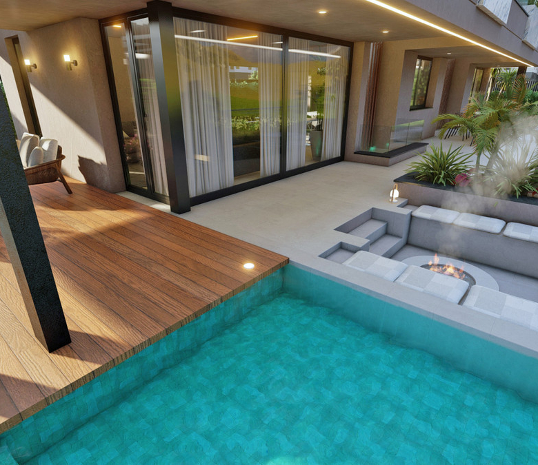The outdoor spaces beautifully mirror the elegance of the interiors, offering a perfect extension of the villa's sophisticated design. A meticulously landscaped garden sets the stage for a spectacular saltwater swimming pool, complete with in-pool ledge loungers for ultimate relaxation. The area also features a stylish fire pit, ideal for gathering under the stars.