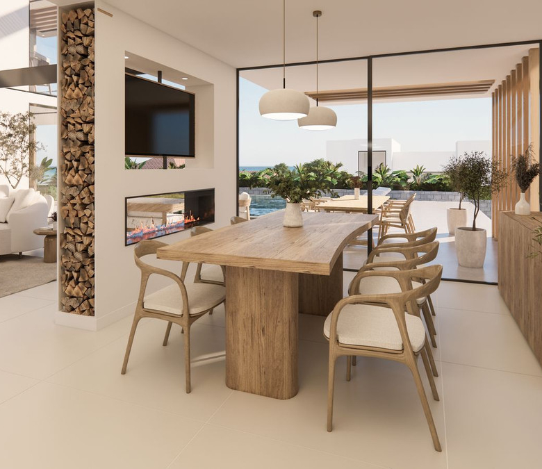 The main terrace includes a sunken lounge with fireplace, a large outdoor dining area and another lounge which is covered by a wooden pergola that creates a mesmerising play of light and shade, a magnificent pool, that makes every day feel like a vacation.