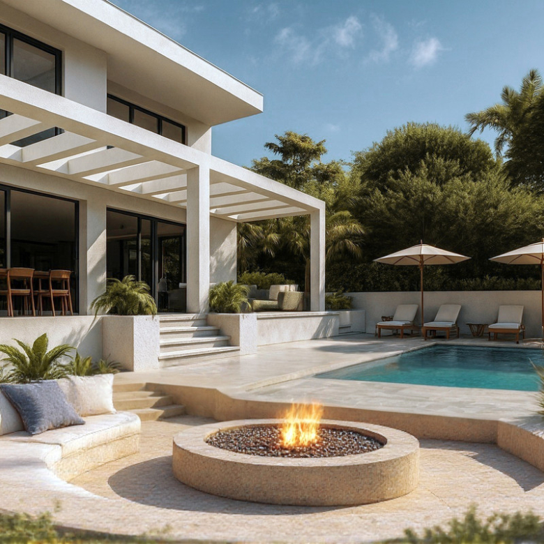 Floor-to-ceiling glass doors lead to a serene outdoor haven featuring cozy lounge areas, a sunken seating nook with a fire feature, an outdoor kitchen, and a stunning infinity-edge pool — all designed to create your own secluded sanctuary.