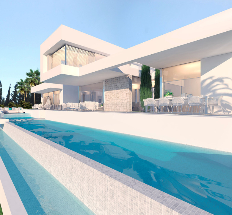 Luxury contemporary villa located in Los Flamingos, a residential and golf area in Benahavís, next to the five-stars Villa Padierna Palace Hotel, offering elegant facilities, spa service and restaurants.