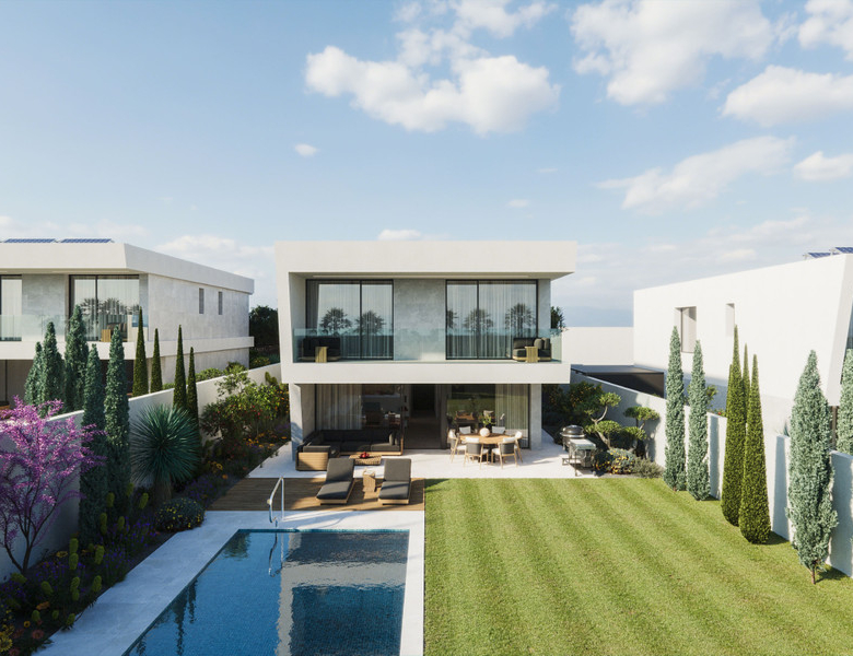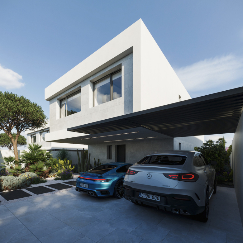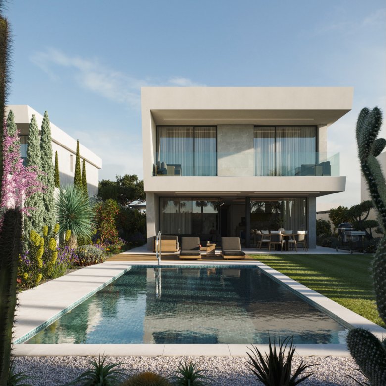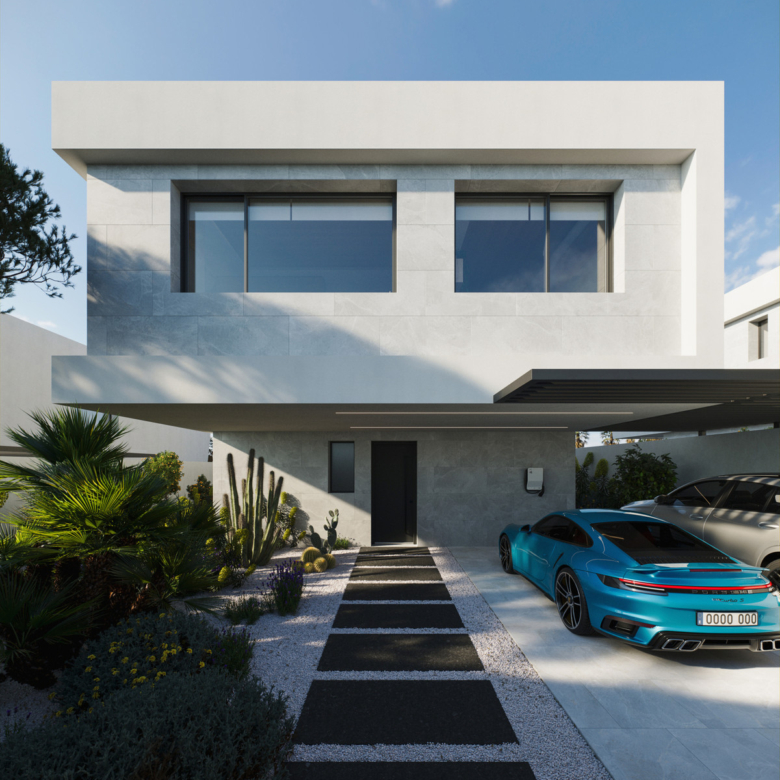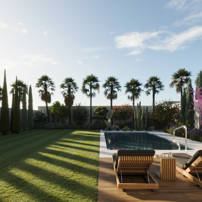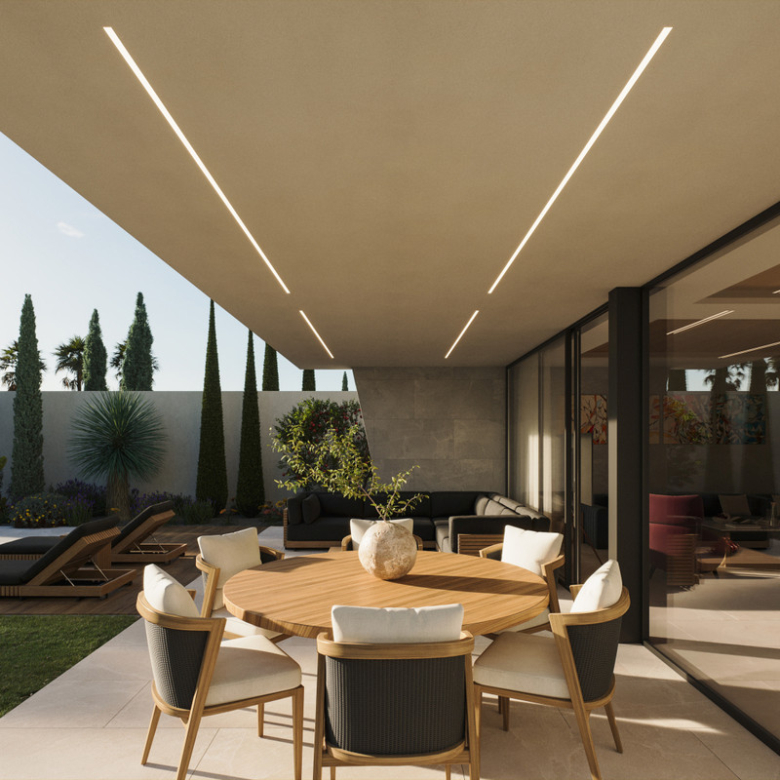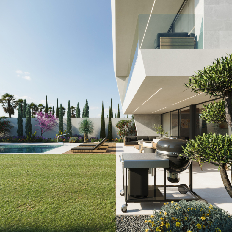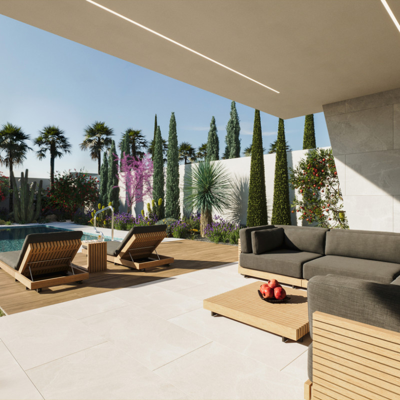 In addition, the villa will be partially furnished with custom-made furniture, which is included in the quoted price. We will be pleased to provide you with a list and technical specifications upon request. Essentially, you will receive all items shown in the visuals, with the exception of the sofa, armchair, chairs, bar stools, mattresses, TV, outdoor furniture, barbecue, and decorations, which can be purchased according to personal preferences.
