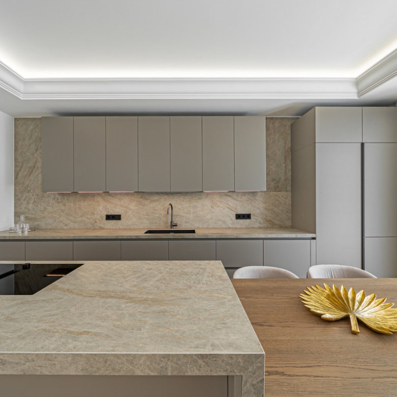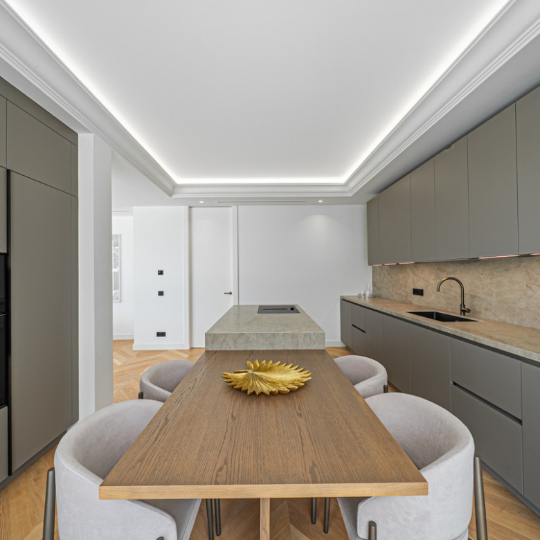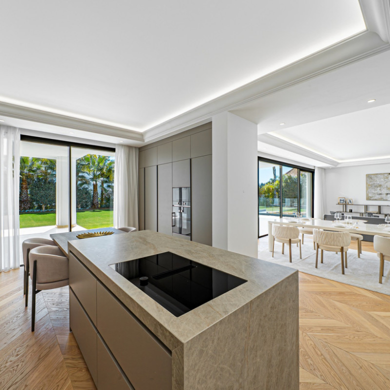 Entering the villa, the main floor has a large space divided into several areas. The fully equipped kitchen with state-of-the-art appliances has a custom-made island.