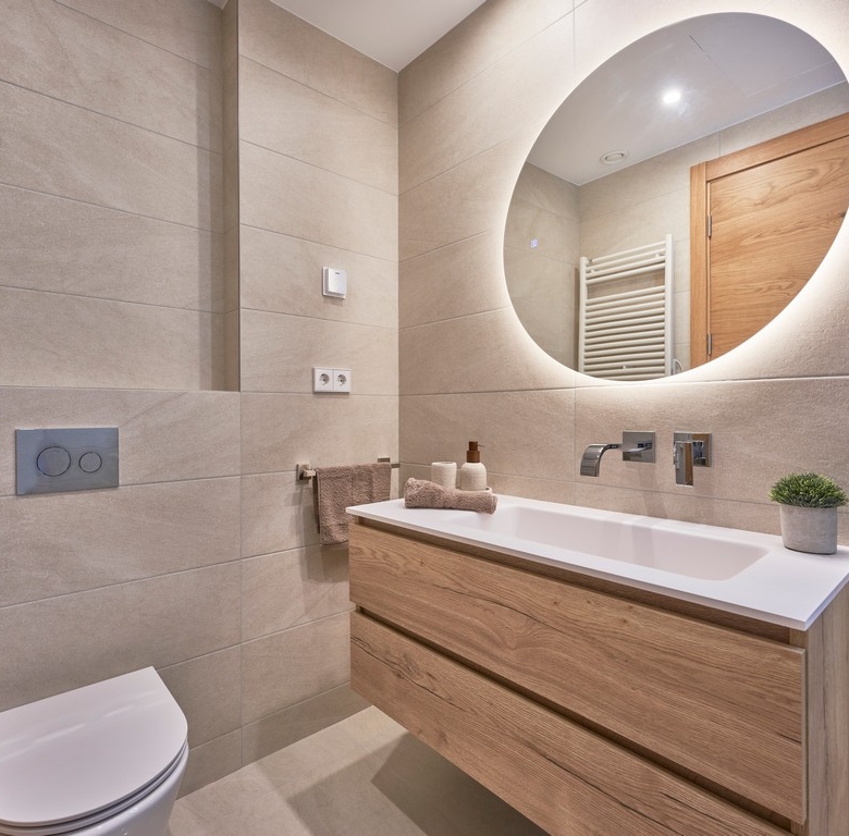 Bathrooms will include a suspended wooden counter unit with one or two washbasins, depending on the plans, a shower with a flush-to-floor shower tray, and recessed taps by Tres.
