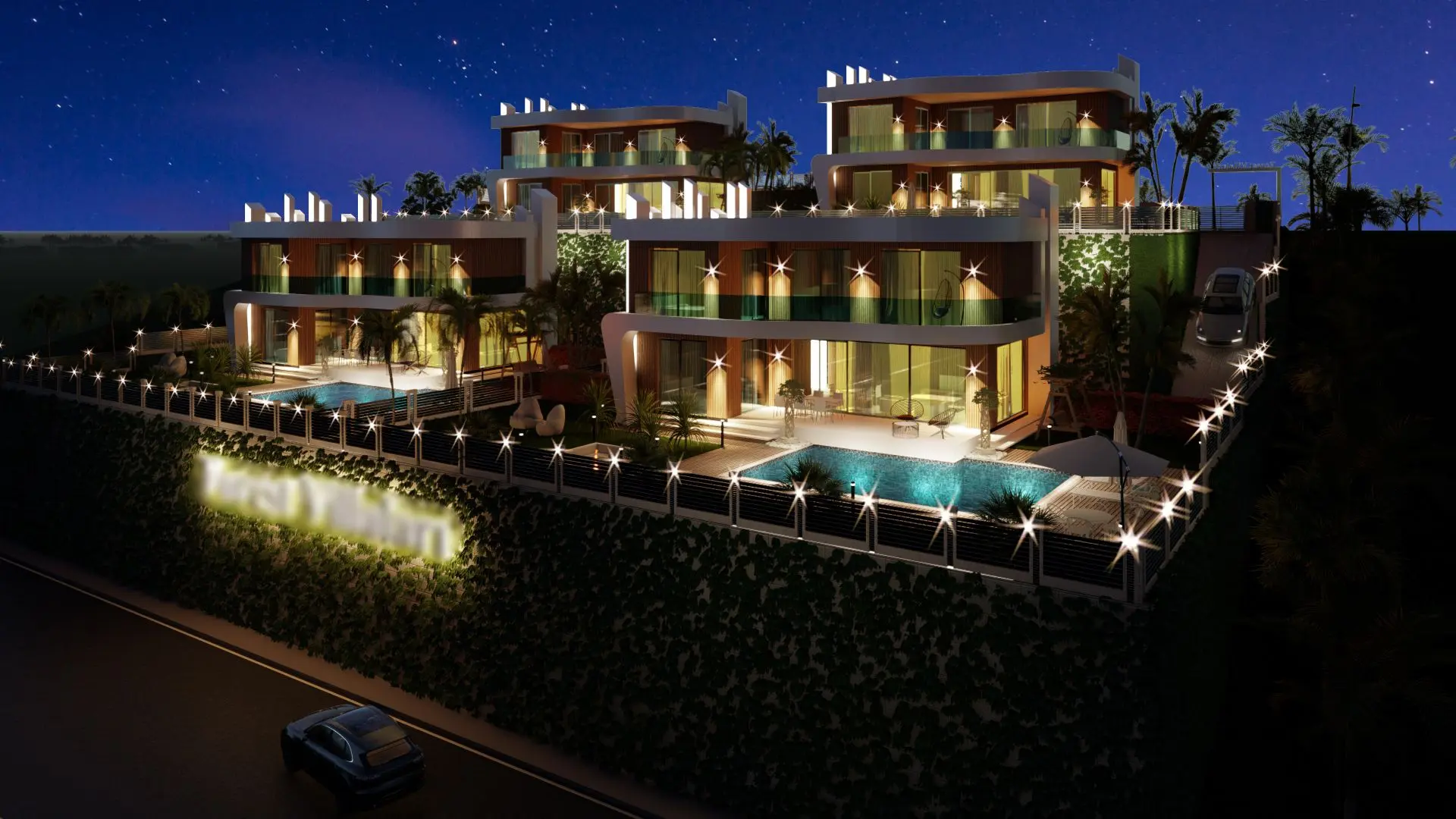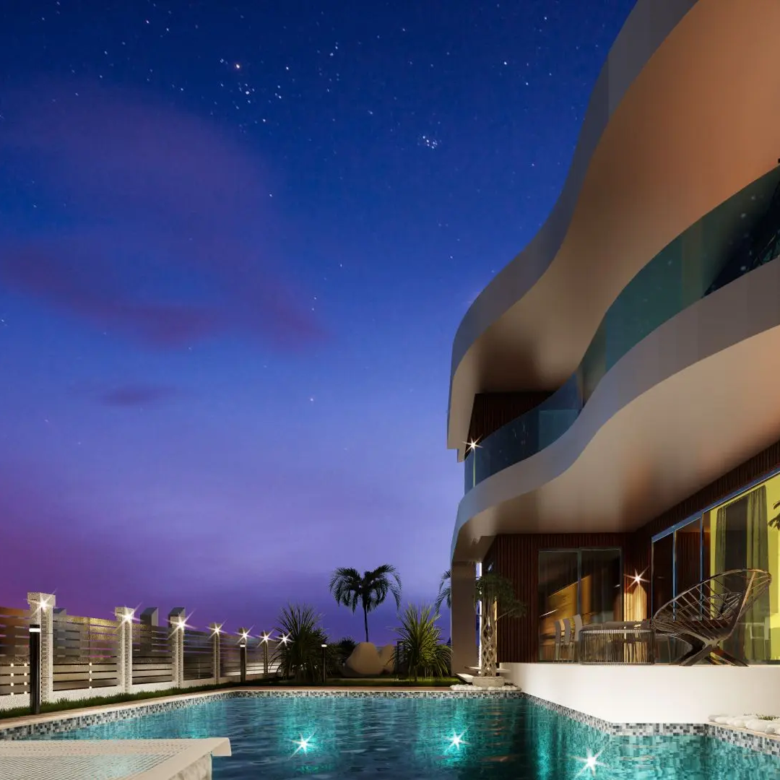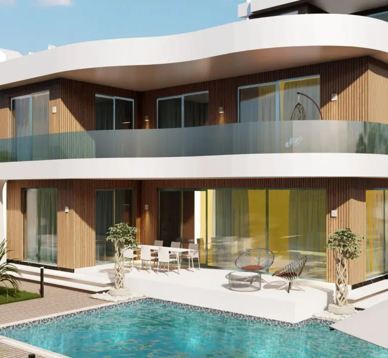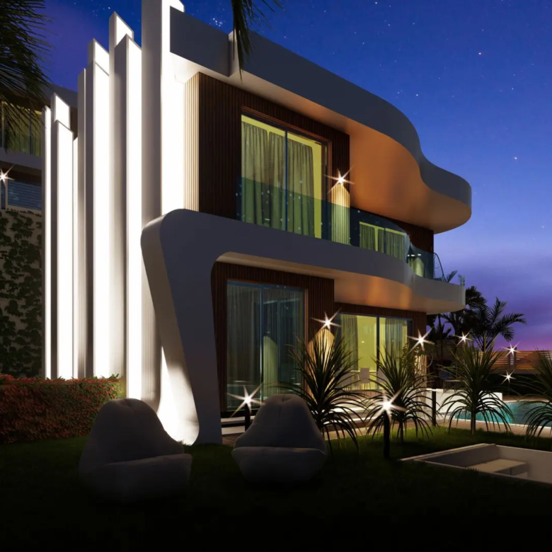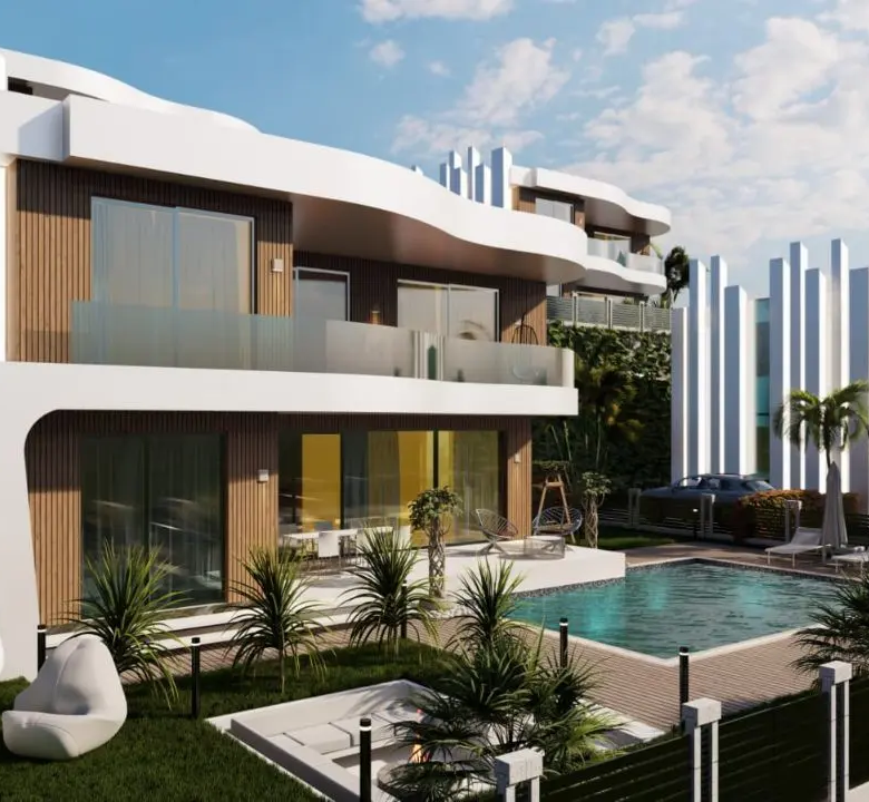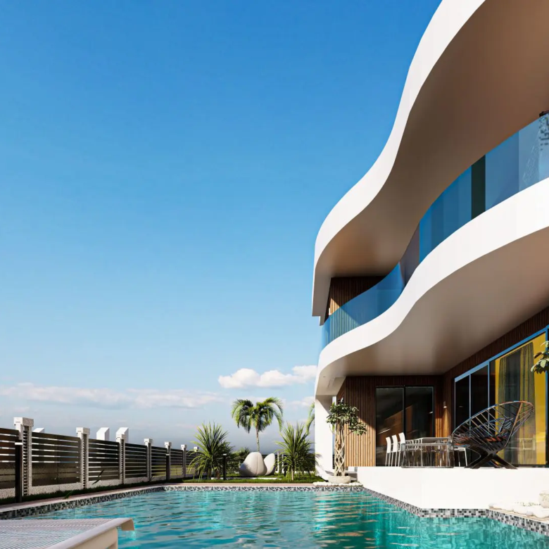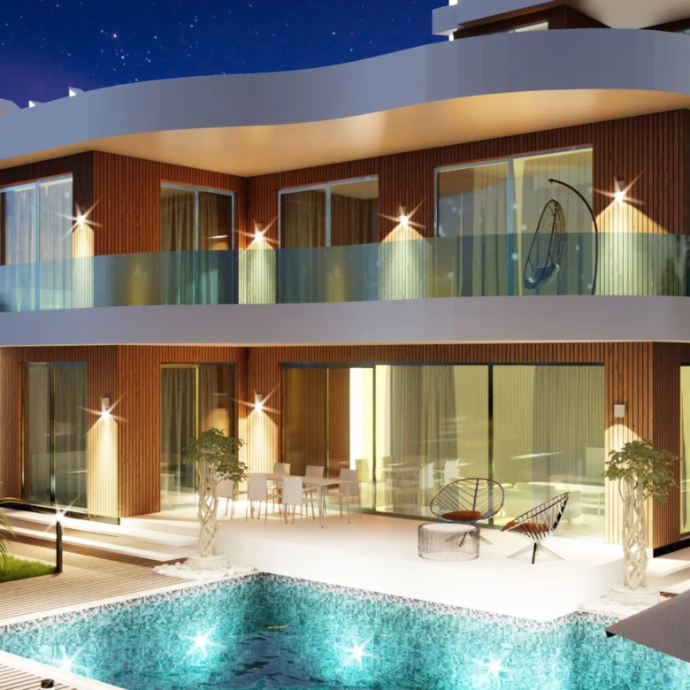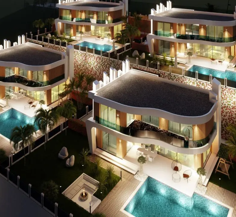 The project includes a generous 200 m2 terrace area and a total construction area of 810 m2, providing ample space for relaxation and entertainment. These villas are thoughtfully situated in a prime location that offers panoramic views of the sea, mountains, and city, ensuring a peaceful and picturesque living environment.