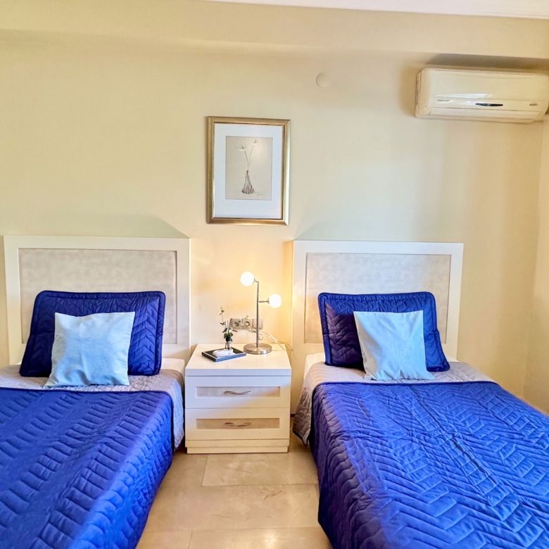 Bedrooms continue the same language: upholstered headboards, practical storage, and textiles in blue-gray shades. Mirrors and lighting are chosen to add brightness rather than drama, so the ambience remains gentle. The result is an interior that resembles a well-kept hotel suite but behaves like a private home — you control the schedule, the noise, and the guest list.