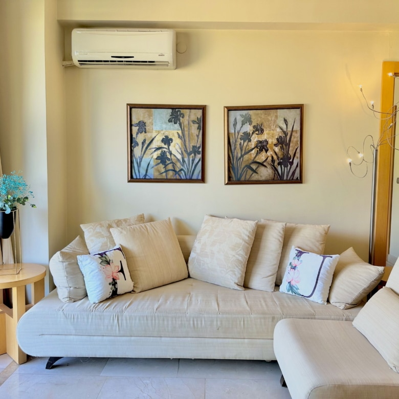 The interior reads “relax” from the doorway. Light beige walls connect seamlessly with neutral flooring; furniture pieces in cream and sand tones create a restful base; blue accents echo the sea views and introduce a cool, coastal note without clichés. The open kitchen balances white lacquer cabinets with a dark countertop; it is a classic, timeless pairing that stays fresh as trends change. Therefore, the apartment feels current now and will age gracefully.