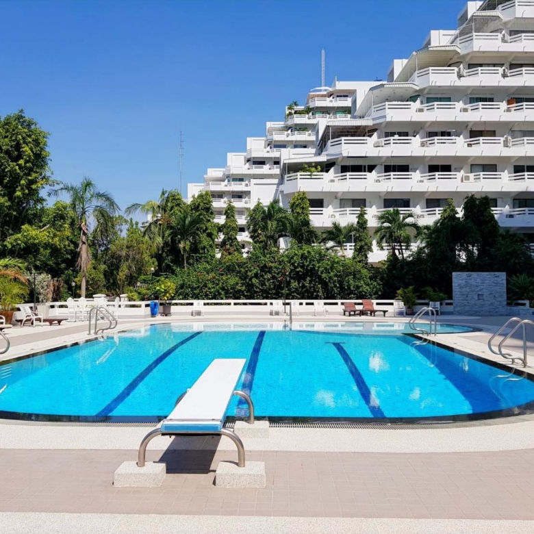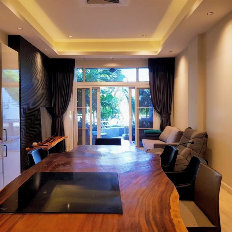 This elegant 115 sq.m 2-bedroom, 2-bathroom condominium is located in the well-established Grand Condotel, a low-rise beachfront residence positioned in one of Jomtien’s most desirable locations. With its direct access to Dongtan Beach via a private walkway, this community is known for its peaceful atmosphere, large land plot with mature greenery, and resort-style layout — ideal for those seeking a quiet home near the beach with generous living space.