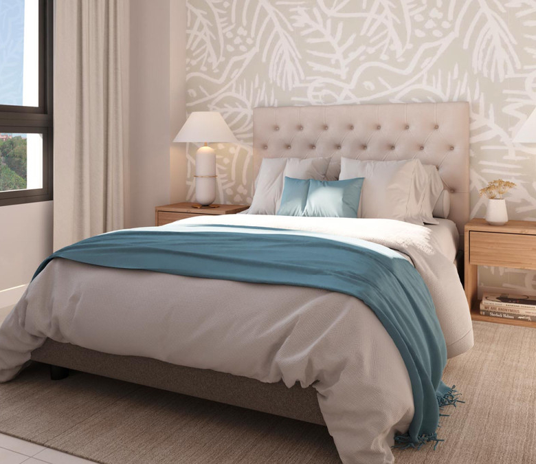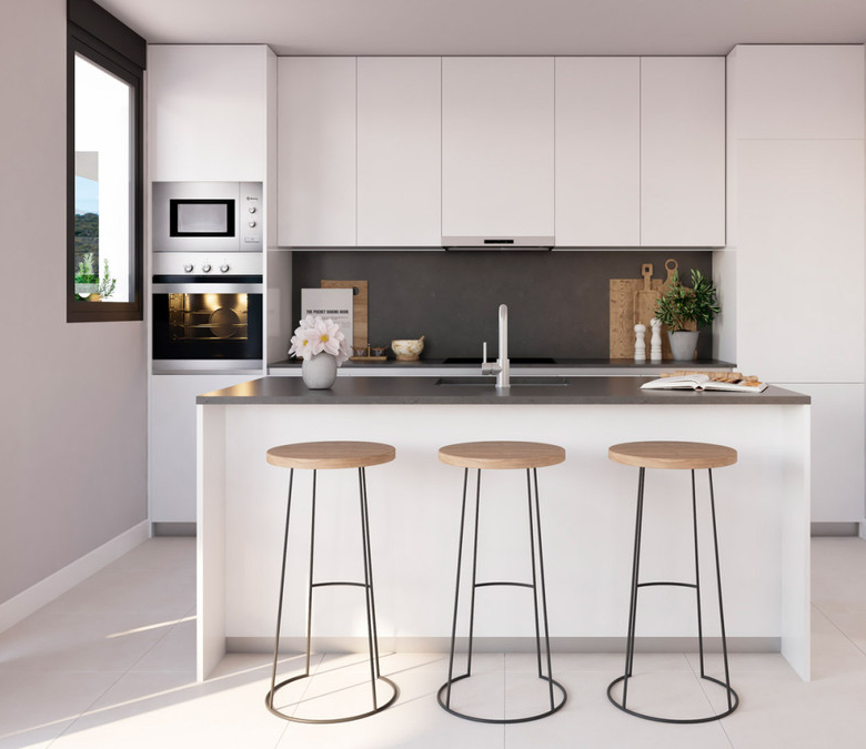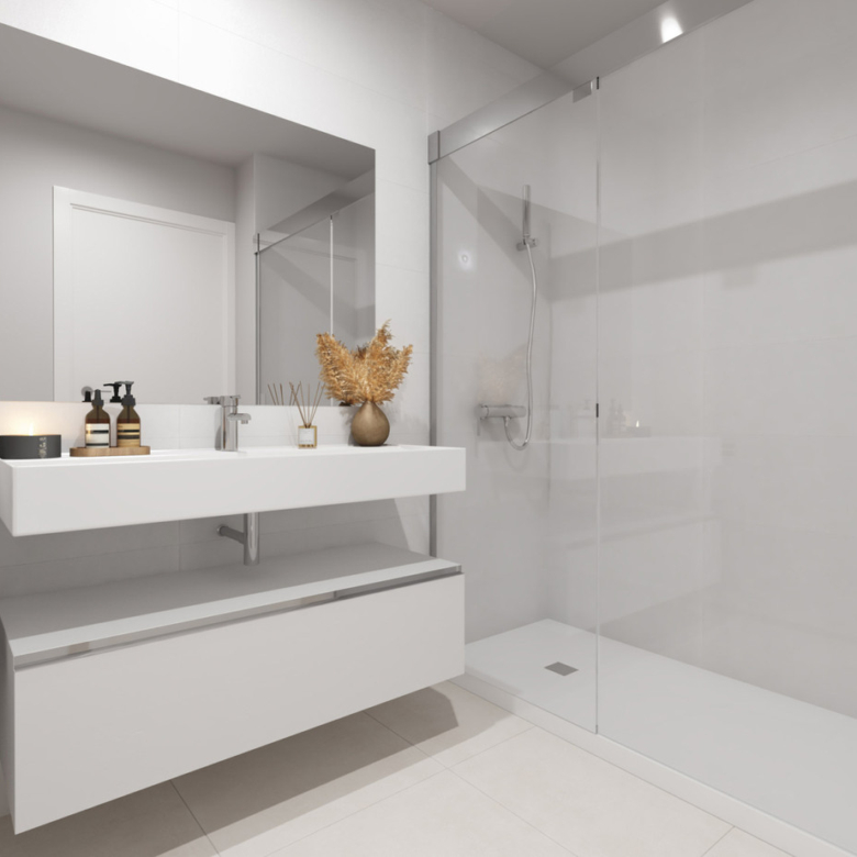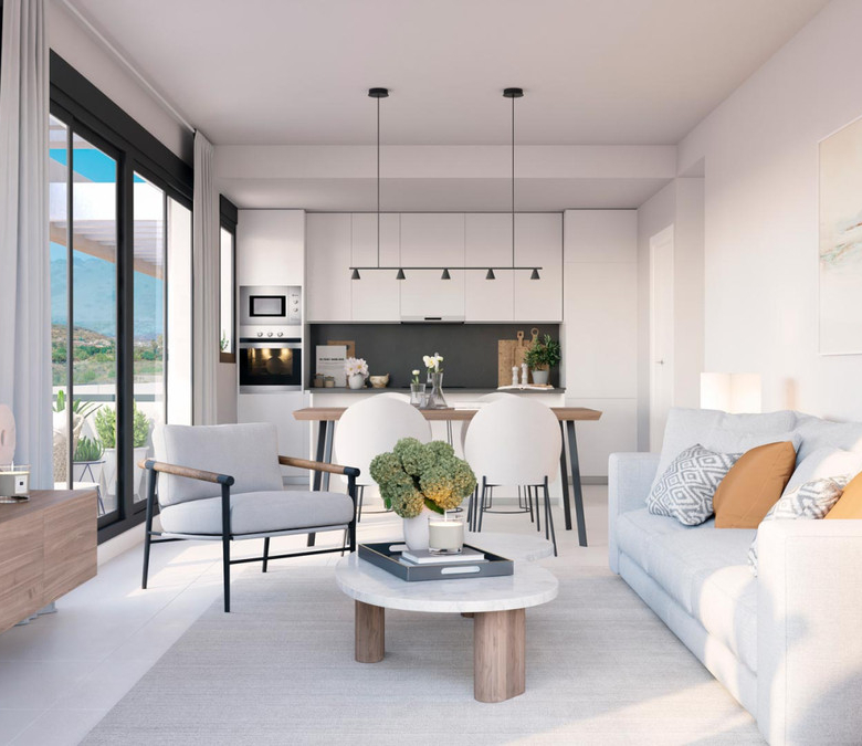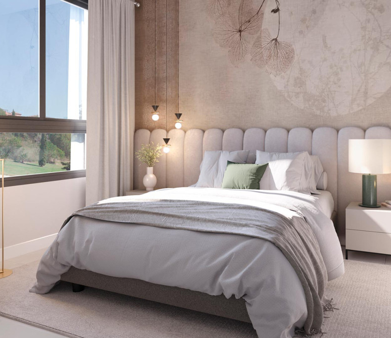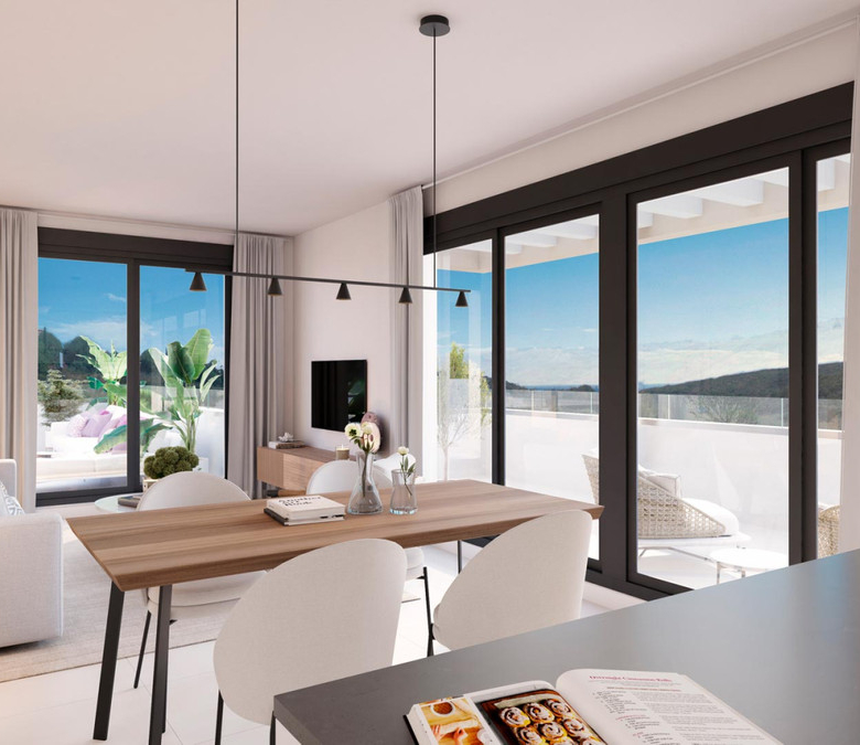 The development features nine blocks with west-southwest orientation, maximising natural light and offering views of the surrounding landscape, some with sea views. Communal areas include gardens, a swimming pool, and a gym. The complex is equipped with a sophisticated security system and first-class wellness facilities. Each home is designed to optimise space, ensuring functionality and aesthetics. Living and dining rooms connect to spacious terraces, and open-plan kitchens are fully equipped with state-of-the-art, energy-efficient appliances. The development is committed to sustainability without sacrificing comfort.