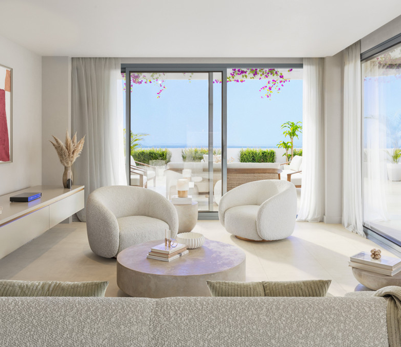 Materials in natural tones, soft ivory palettes, and curved lines create an atmosphere of warmth and serenity. The ground-floor residences feature elevated gardens that ensure natural privacy, while the exclusive penthouses offer panoramic terraces designed to capture unforgettable sunsets.