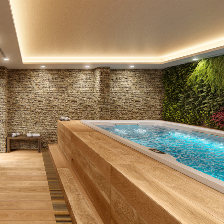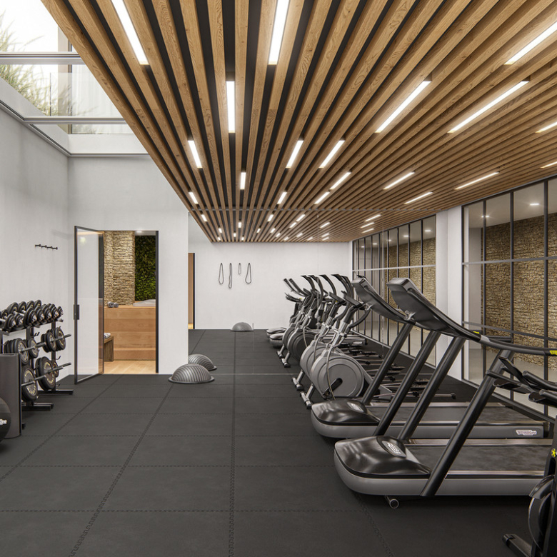 A communal infinity swimming pool with a beach entry, a fitness room, an endless pool fitness system, and a multipurpose room with a wine cellar to collect your own bottles, are the facilities in the communal areas.