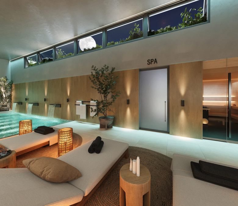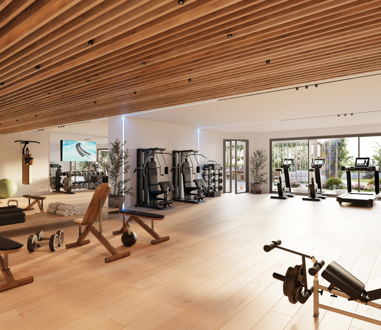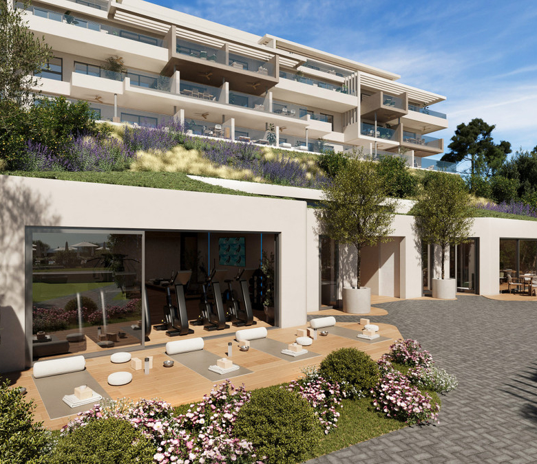 To complement this unique experience, the project offers a wide variety of communal spaces designed for your wellbeing. The complex has a plot area of 31,000 m², which includes two saltwater swimming pools (one of them infinity designed for swimming), a wellness area of more than 300 m2, including a gymnasium equipped with state-of-the-art machinery with natural light and ventilation, a spa with heated pool and sauna with changing rooms and shower, a social and coworking room, an outdoor lounge – kitchen with chillout area an ideal space for shared outdoor experience, an outdoor yoga terrace, a children's play area, a Volleyball Court with beach sand multi-purpose to practice Padel Beach., a putting green, organic vegetable gardens, a viewpoint with reading area, footpaths and extensive integrated natural areas.