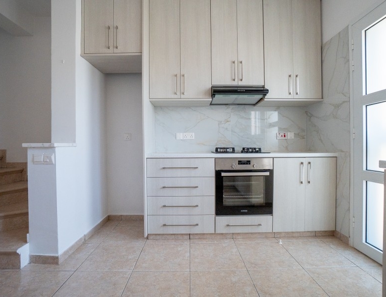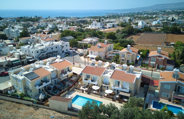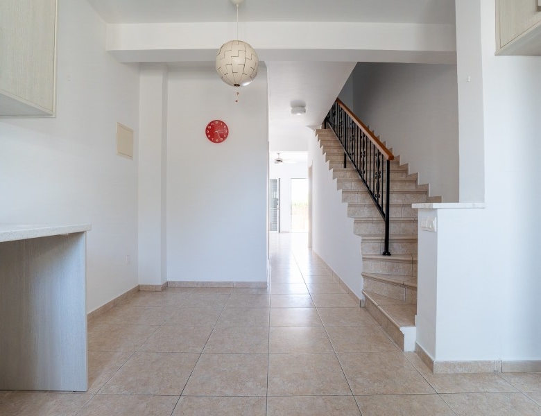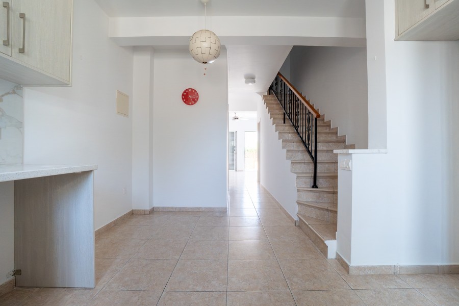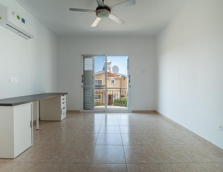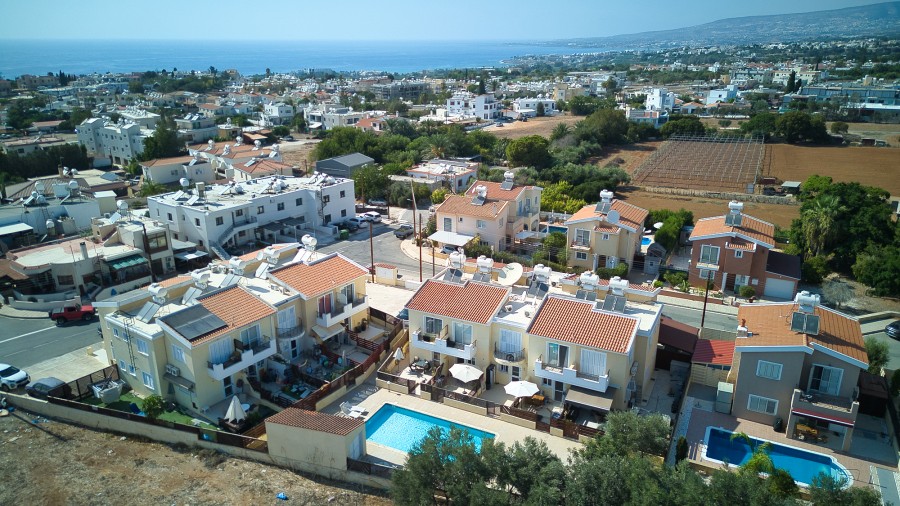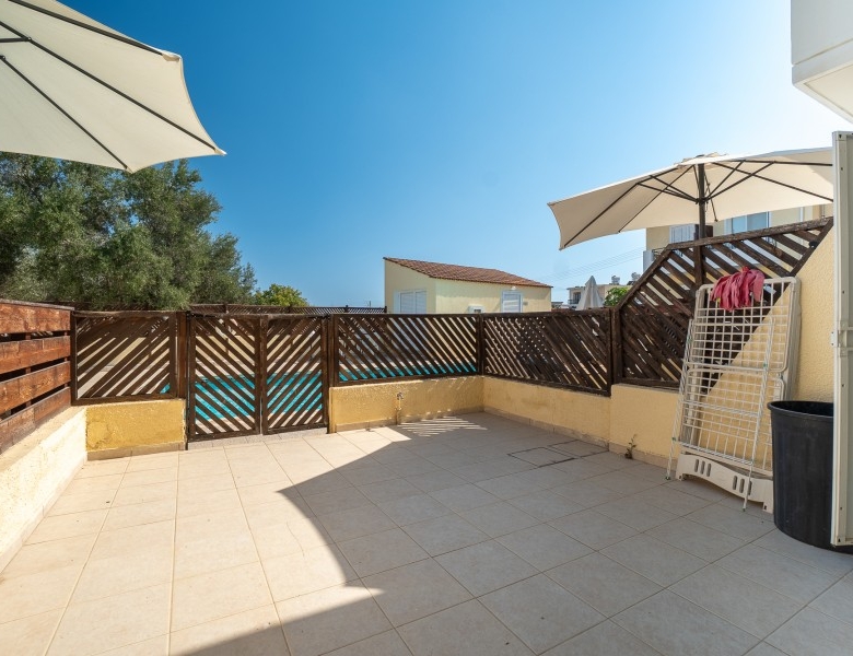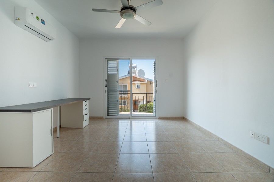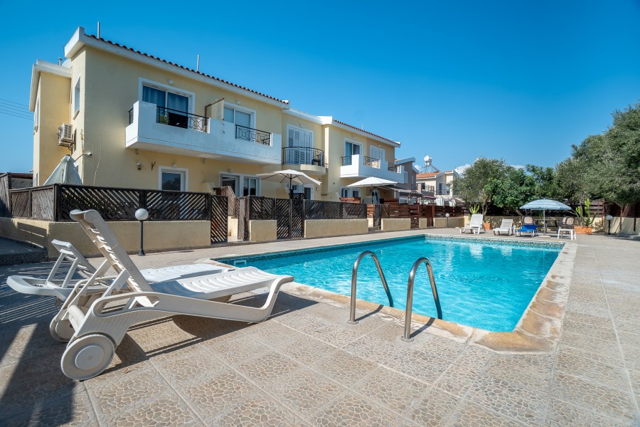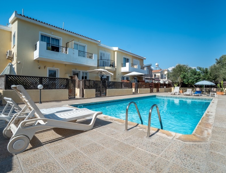 This charming two-bedroom townhouse is located in a peaceful cul-de-sac in Chloraka, making it an ideal home for families. Conveniently situated just minutes away from supermarkets, banks, schools, nurseries, and other essential amenities, this property offers both comfort and convenience. The development features a communal swimming pool complete with showers, toilets, sunbeds, and umbrellas, perfect for relaxation and leisure. The property itself is fully enclosed, with a front veranda and small garden as well as a rear veranda for added outdoor space. Upon entering through the front door, you’ll find a welcoming living area that flows seamlessly into the kitchen and dining area. The ground floor also includes a guest cloakroom with shower and a storage cupboard under the stairs for practicality. Upstairs, there are two spacious bedrooms, each with fitted wardrobes, additional storage, and private balconies. These bedrooms share a well-appointed family bathroom featuring a shower screen and vanity unit.