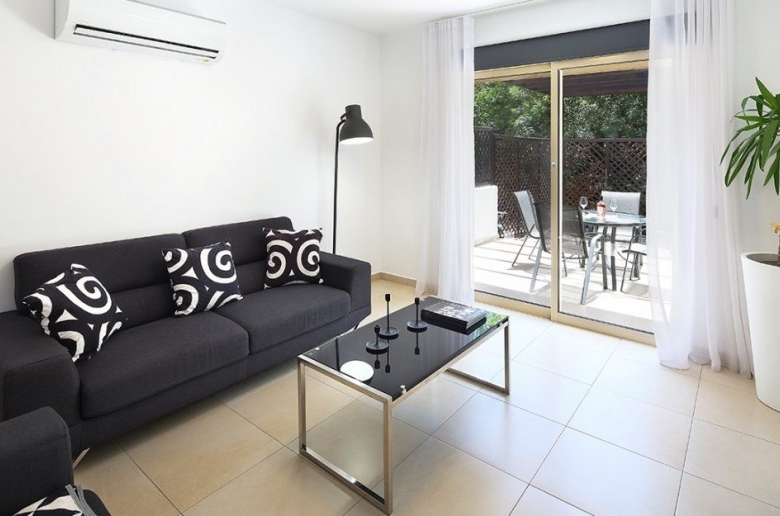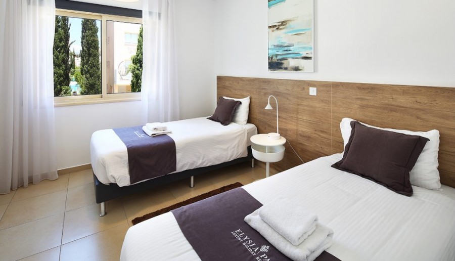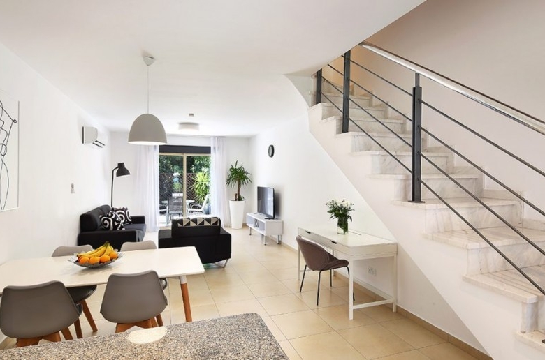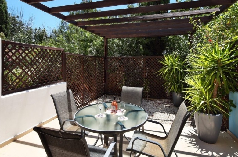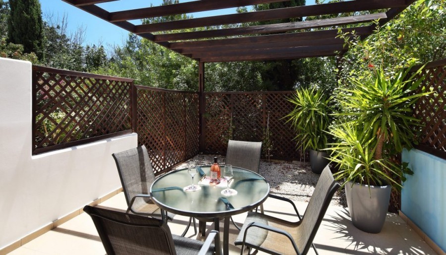 2 bedroom townhouse is located in the most exclusive resort in Pafos, which has been designed to accommodate the comfort, relaxation, and enjoyment of the discerning property owner, offering a wealth of services and facilities unparallel in the area. This spacious townhouse comprises an open plan living and dining area with patio doors giving access to a large partly covered veranda with generous garden space,  offering excellent views to the surrounding complex lush green areas. A fully equipped modern kitchen is conveniently located to the right as you enter. A cloakroom is also located on the ground level.  On the upper level, there are two large bedrooms with fitted wardrobes and balconies and a family bathroom.  The Master bedroom also offers en-suite facilities.