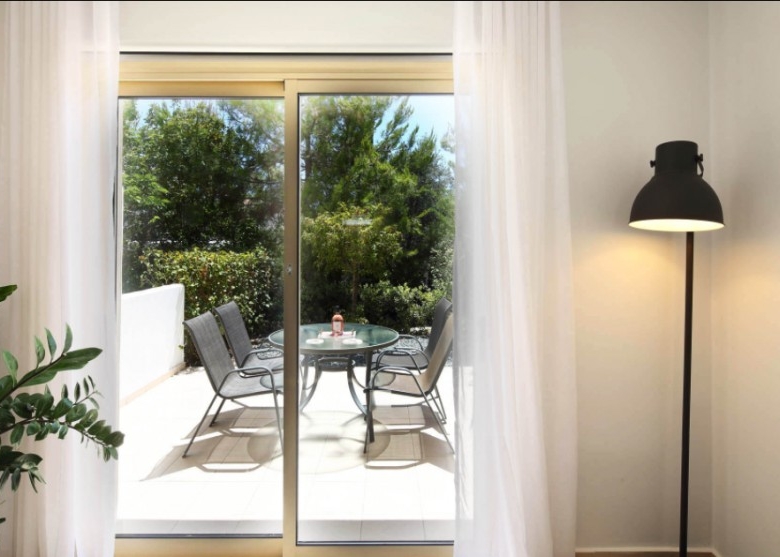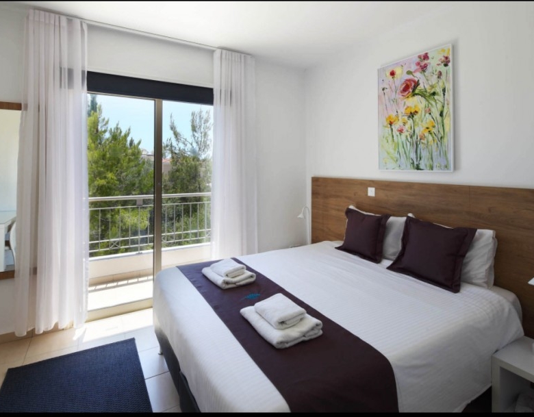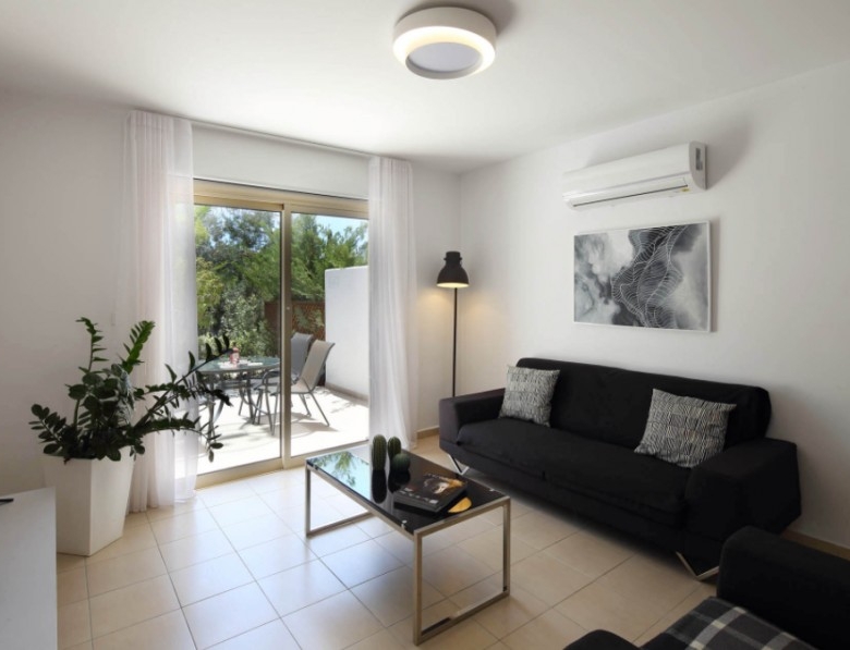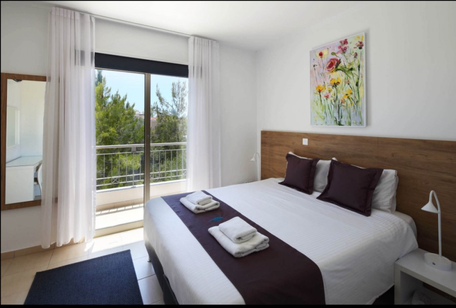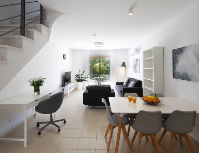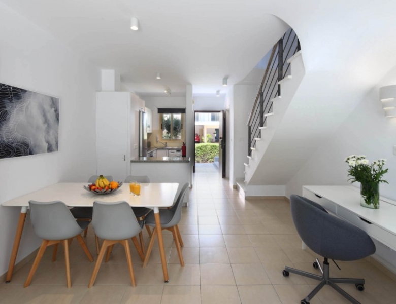 2 bedroom townhouse is located in the most exclusive resort in Pafos, which has been designed to accommodate the comfort, relaxation, and enjoyment of the discerning property owner, offering a wealth of services and facilities unparallel in the area. This spacious townhouse comprises an open plan living and dining area with patio doors giving access to a large partly covered veranda with generous garden space, offering excellent views to the surrounding complex lush green areas. A fully equipped modern kitchen is conveniently located to the right as you enter. A cloakroom is also located on the ground level. On the upper level, there are two large bedrooms with fitted wardrobes and balconies and a family bathroom. The Master bedroom also offers en-suite facilities.