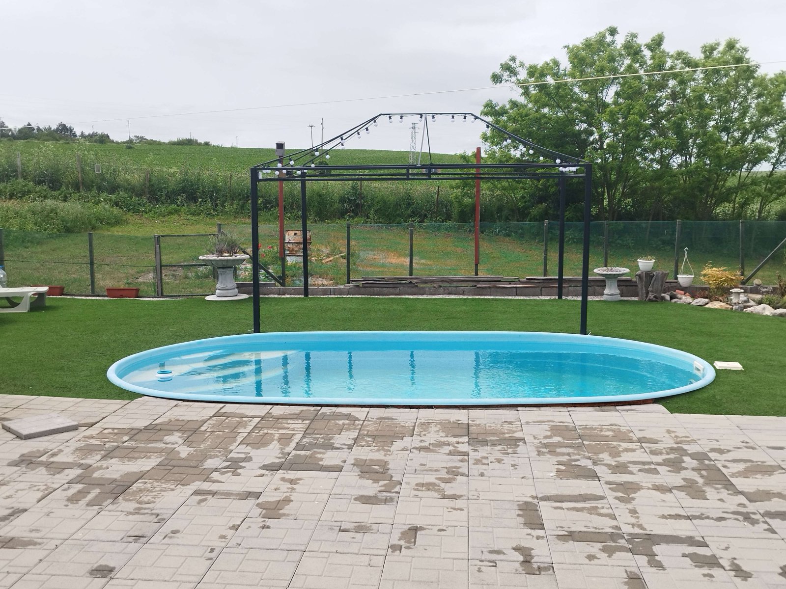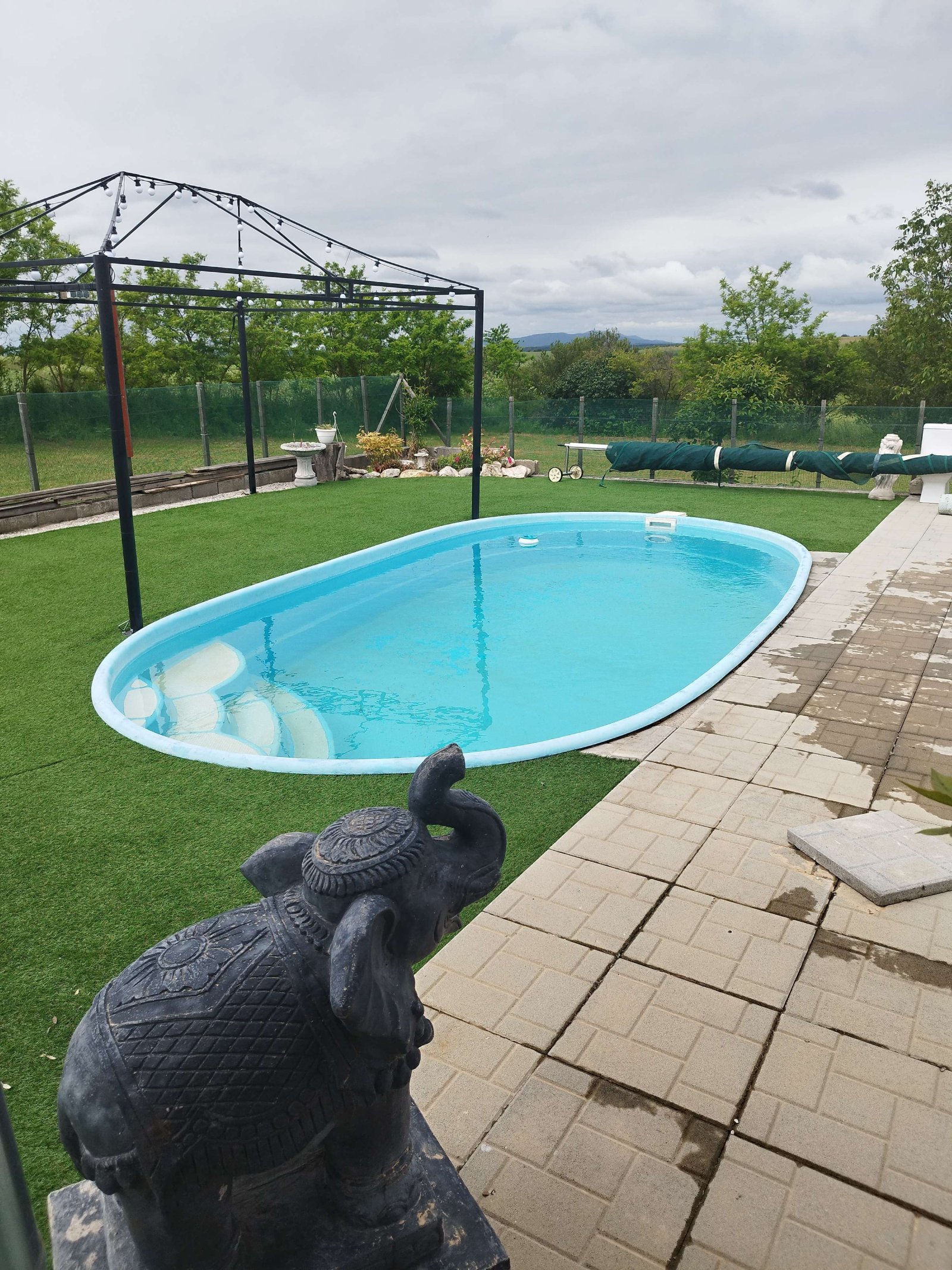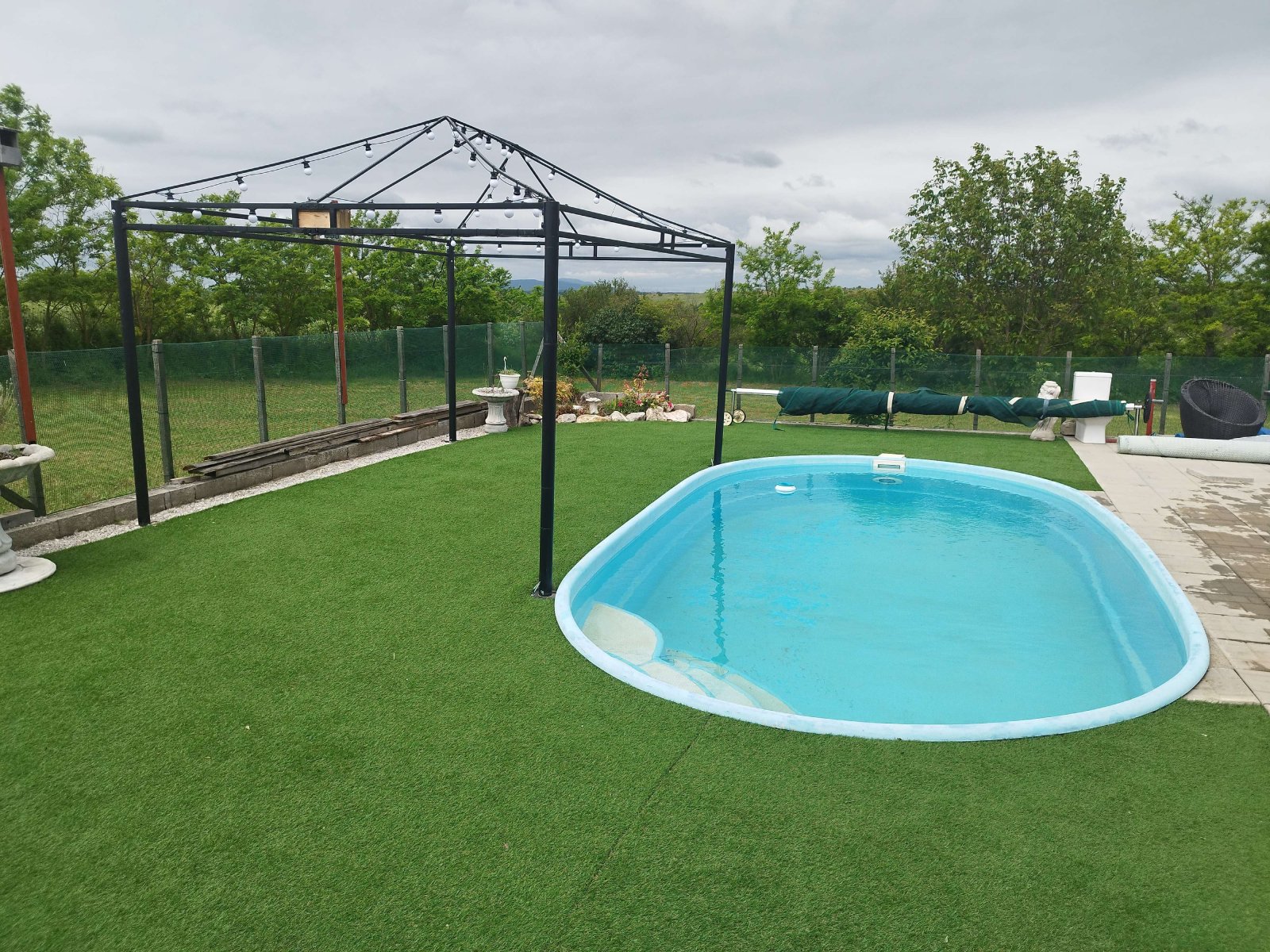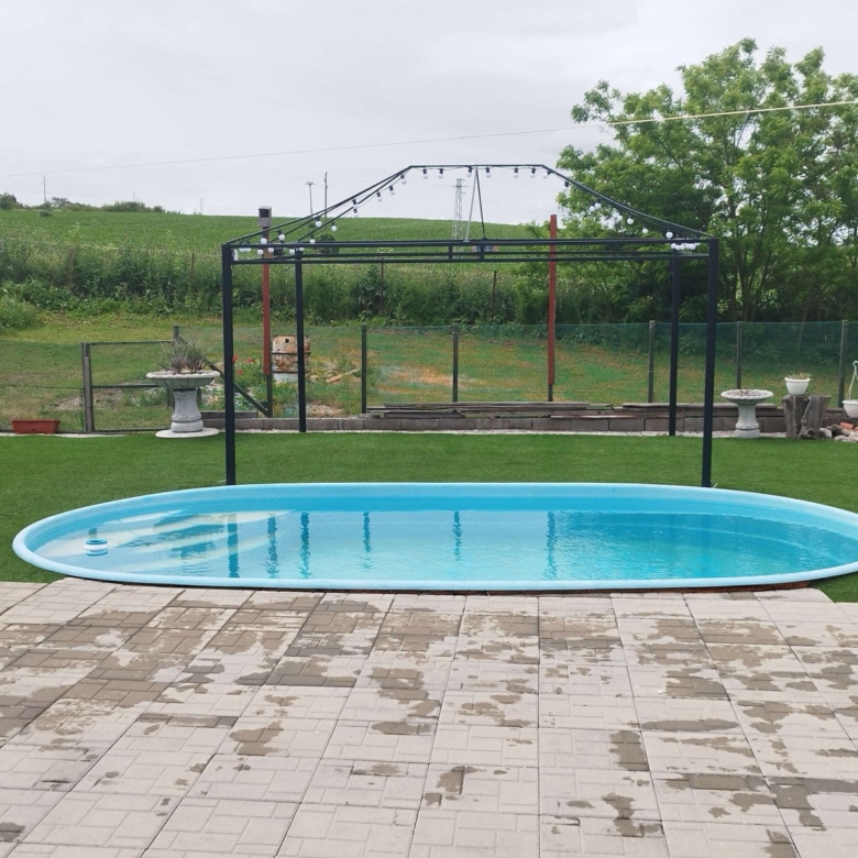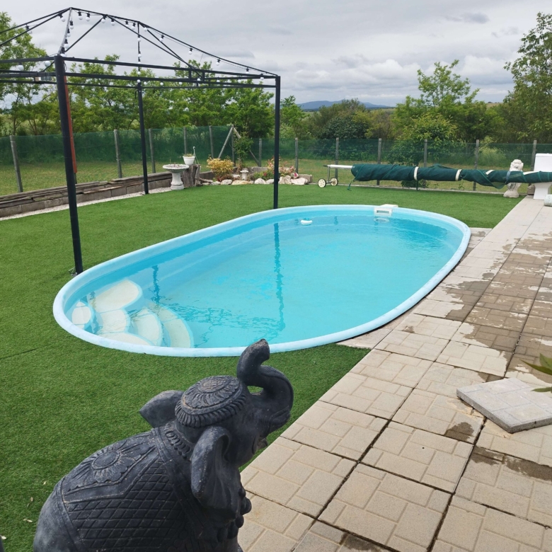 Large house: Kitchen, living room, two bedrooms, bathroom with WC, enclosed veranda (approx. 30 m²) overlooking the pool, and an open bar area with oven and barbecue.