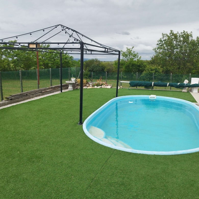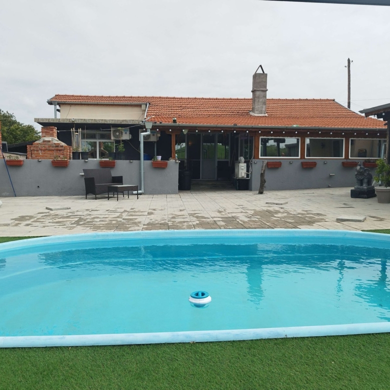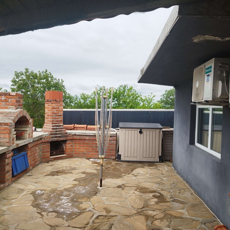 The house is fully renovated and equipped, featuring PVC windows, new electrical wiring, new plumbing, new roof, new doors, etc. Heating in winter is provided by a pellet fireplace. It includes four air conditioners and several TVs. Flooring is terracotta and laminate.