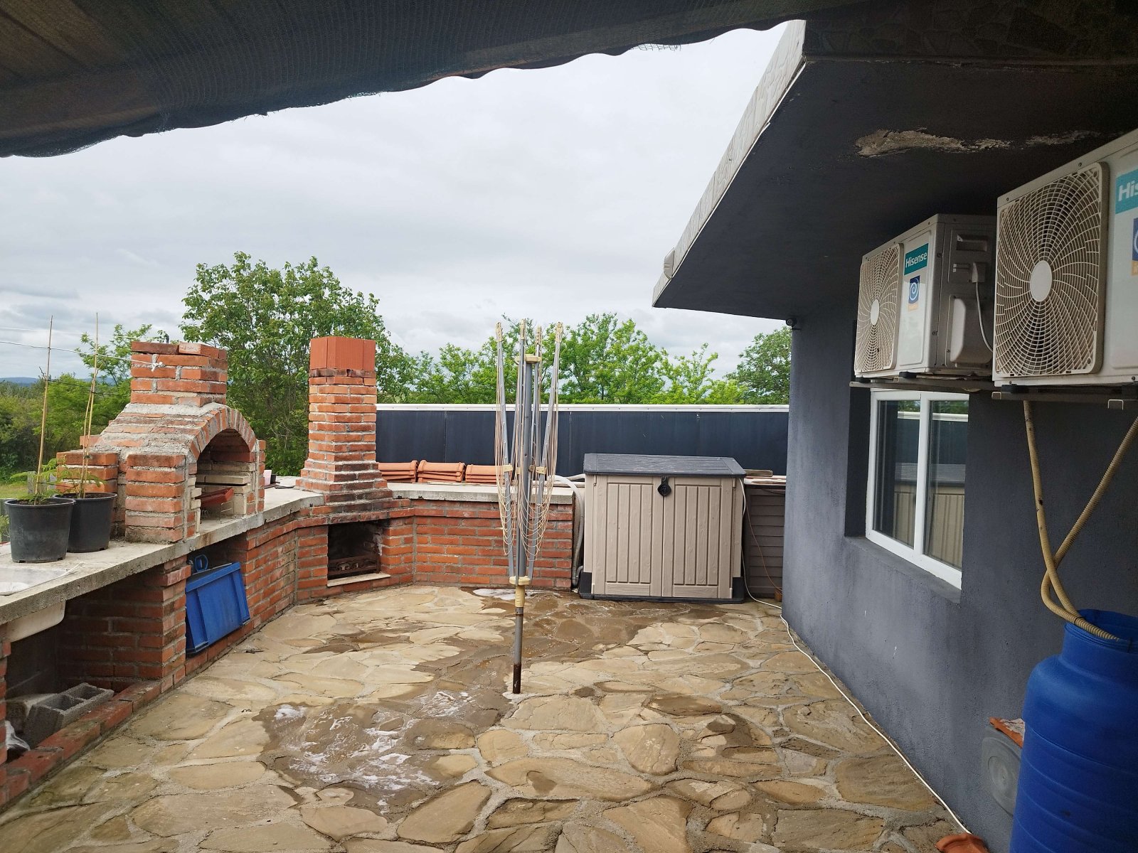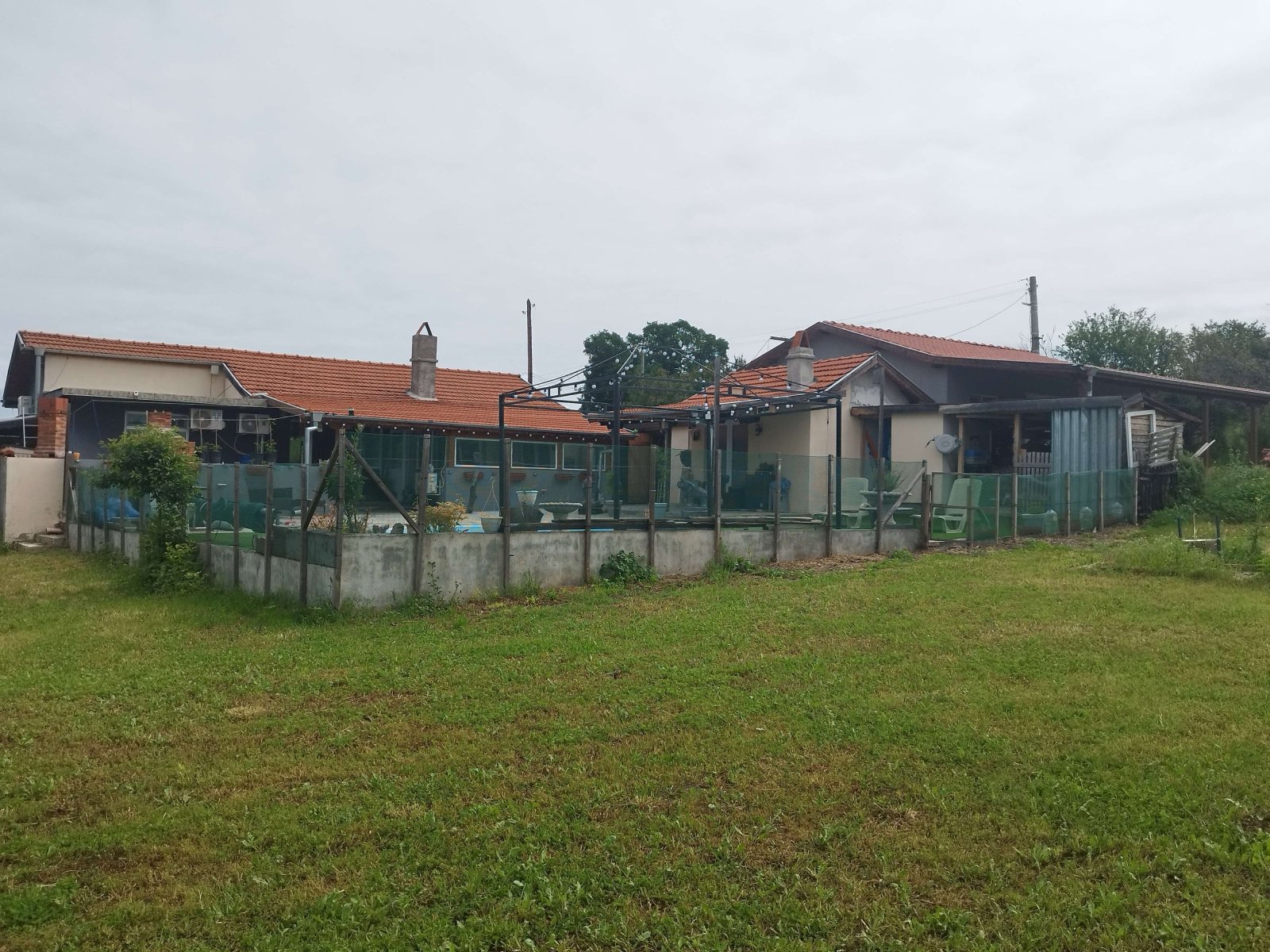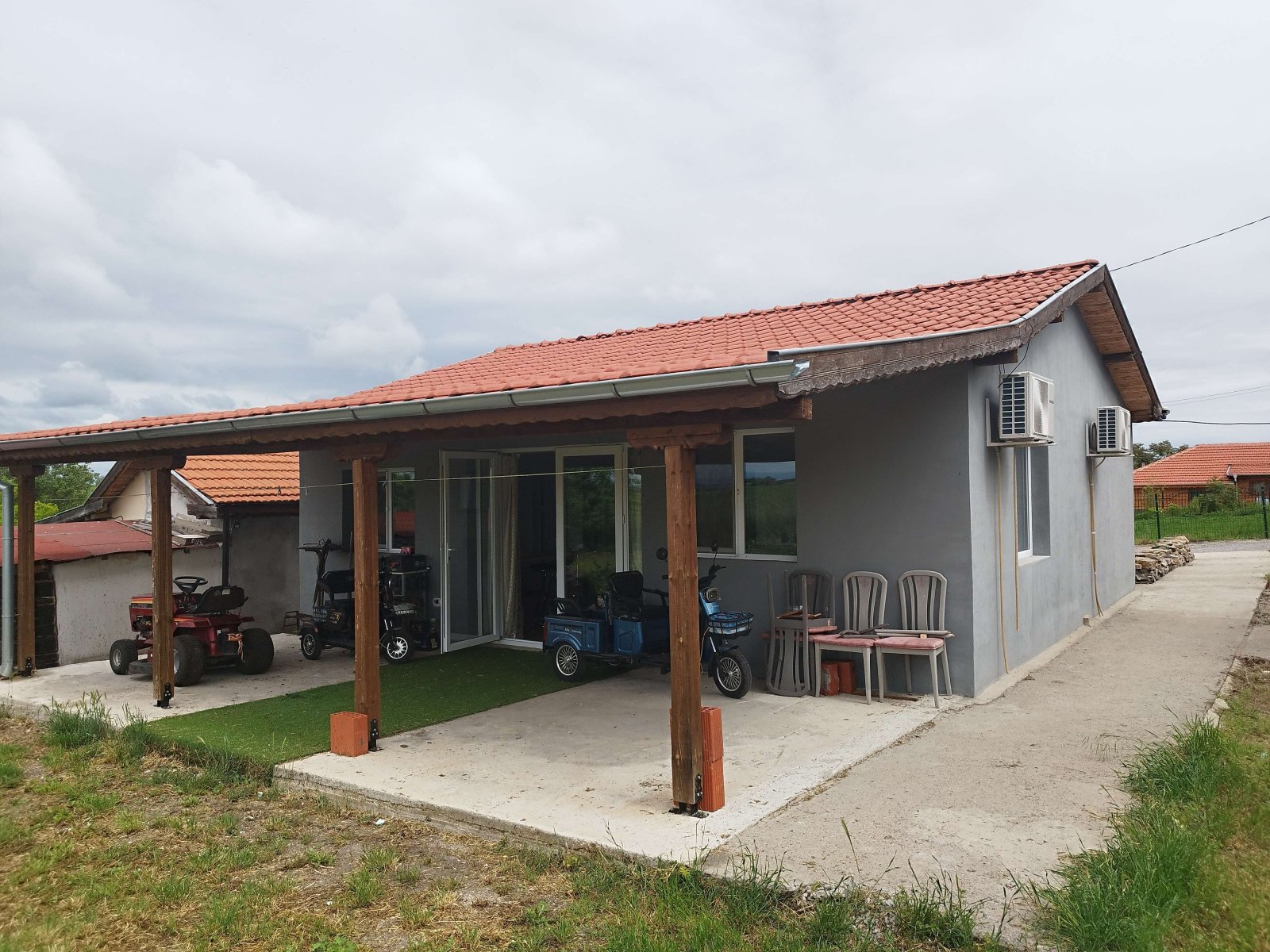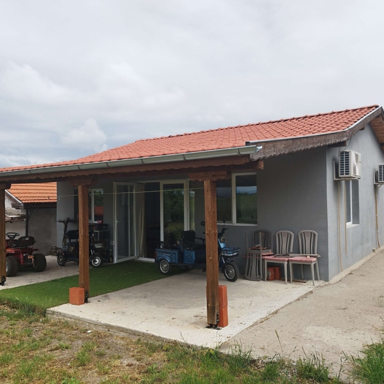 Small house: Kitchen with bar counter and living room, two bedrooms, bathroom with WC and bathtub, open veranda. Heating in winter is provided by four air conditioners. Flooring is terracotta and laminate. PVC windows, new electrical wiring, new plumbing, new roof, new doors, etc.