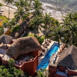Outdoor spaces are designed for relaxation and entertainment, with a large infinity-edge pool, beachfront lounge areas, and multiple palapas offering shaded retreats. The villa also includes a gated entrance, 24-hour security, and lush gardens, creating a private sanctuary along the coastline.