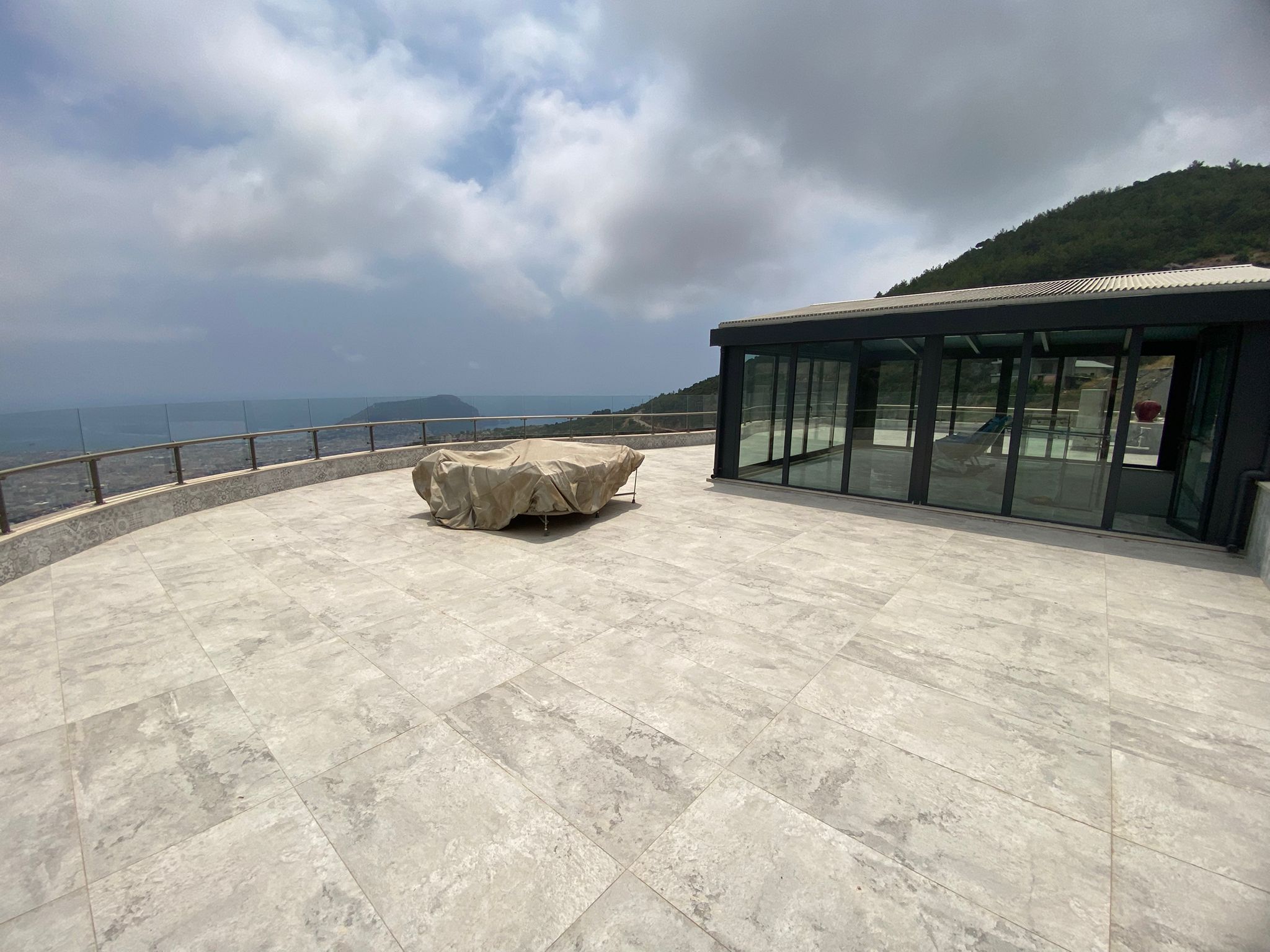 The private pool sits in front, lined with glass to protect the view of the sea and Alanya Castle.