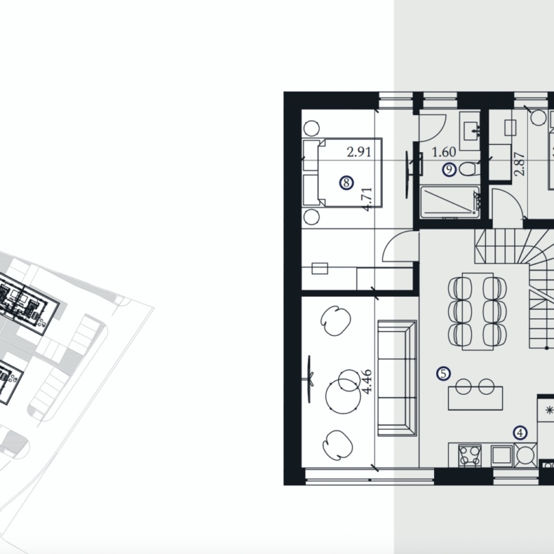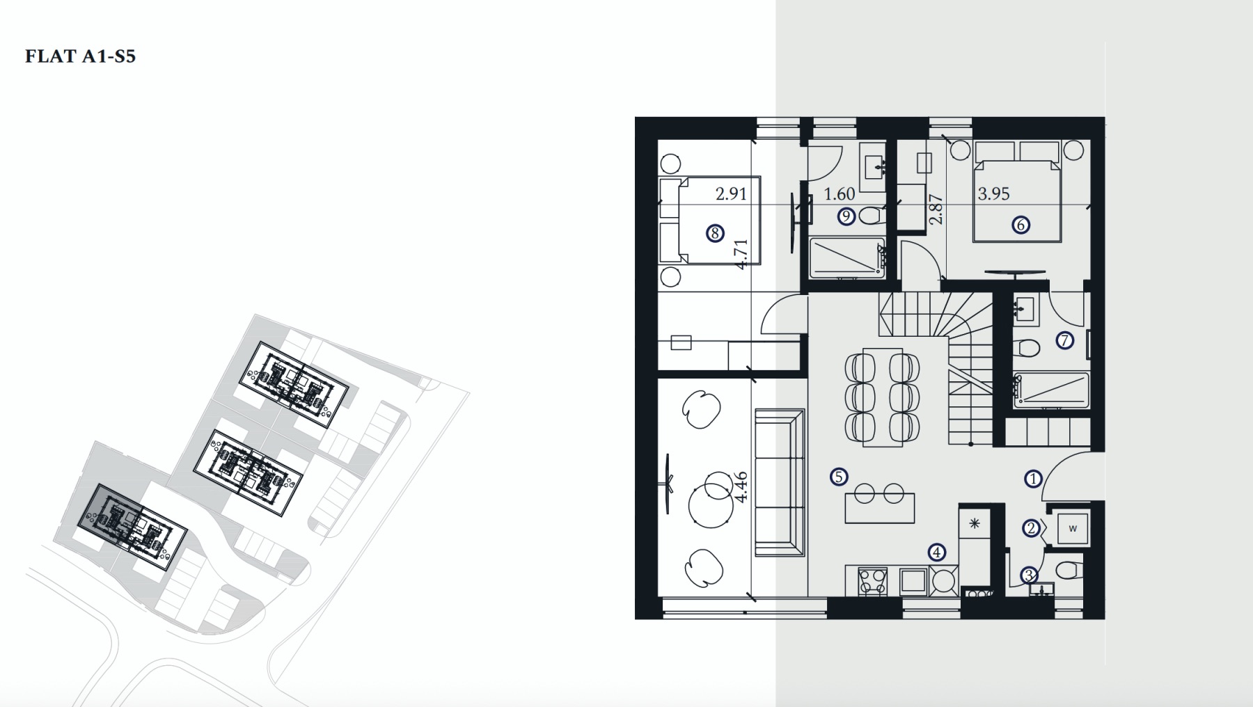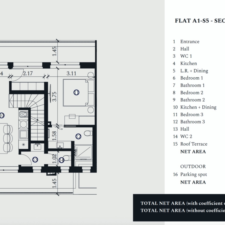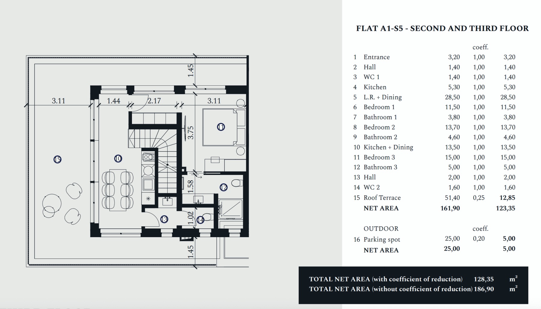 Apartment A1-S5 – 2nd and 3rd floor – living area 110.85 m² (3 bedrooms + 3 bathrooms + 2 WCs) + rooftop terrace (51.40 m²) + two outdoor parking spaces, total net surface 128.35 m² = EUR 707,053.00