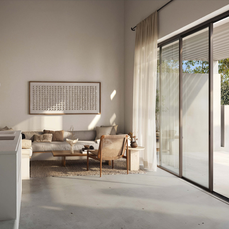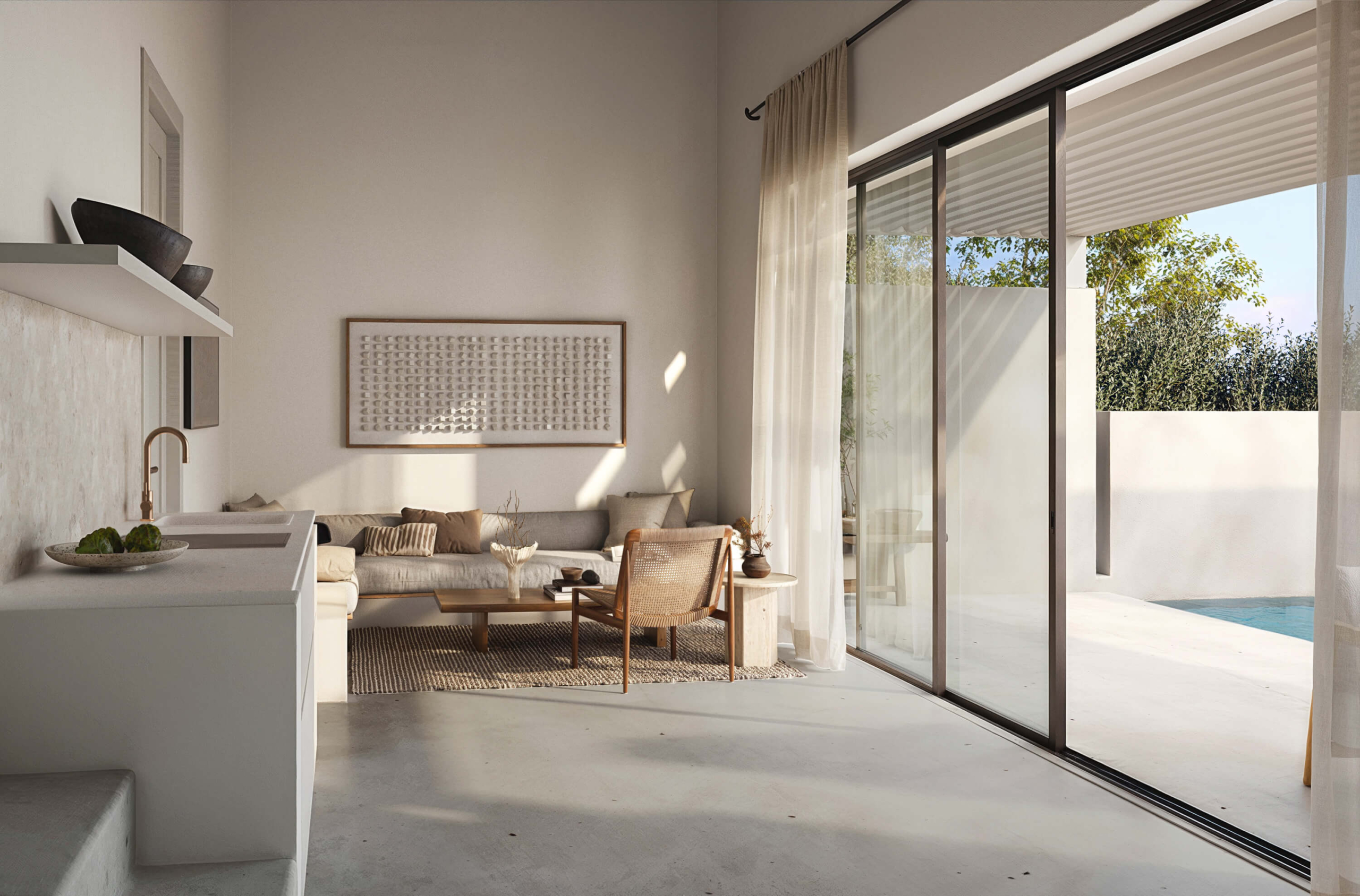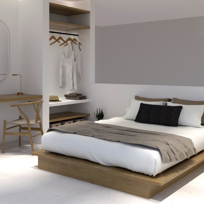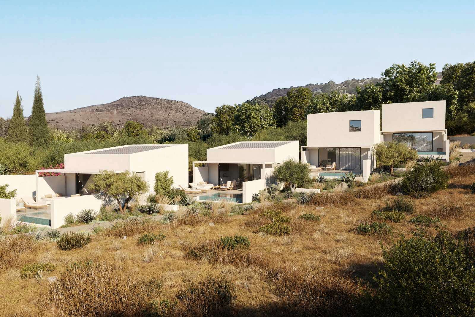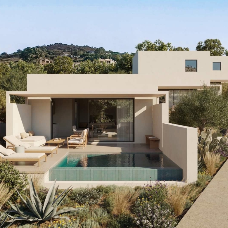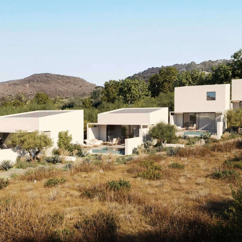 Two single-level residences of 50 sq.m., each complemented by private outdoor areas exceeding 200 sq.m. These homes feature a private infinity pool, one bedroom with en-suite bathroom, a living area with the option to be separated to accommodate up to 4–5 guests, built-in kitchen, air conditioning, refrigerator, insect screens, solar water heater, and independent electricity and water supply.