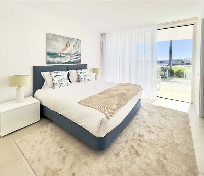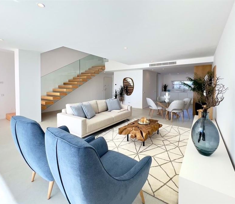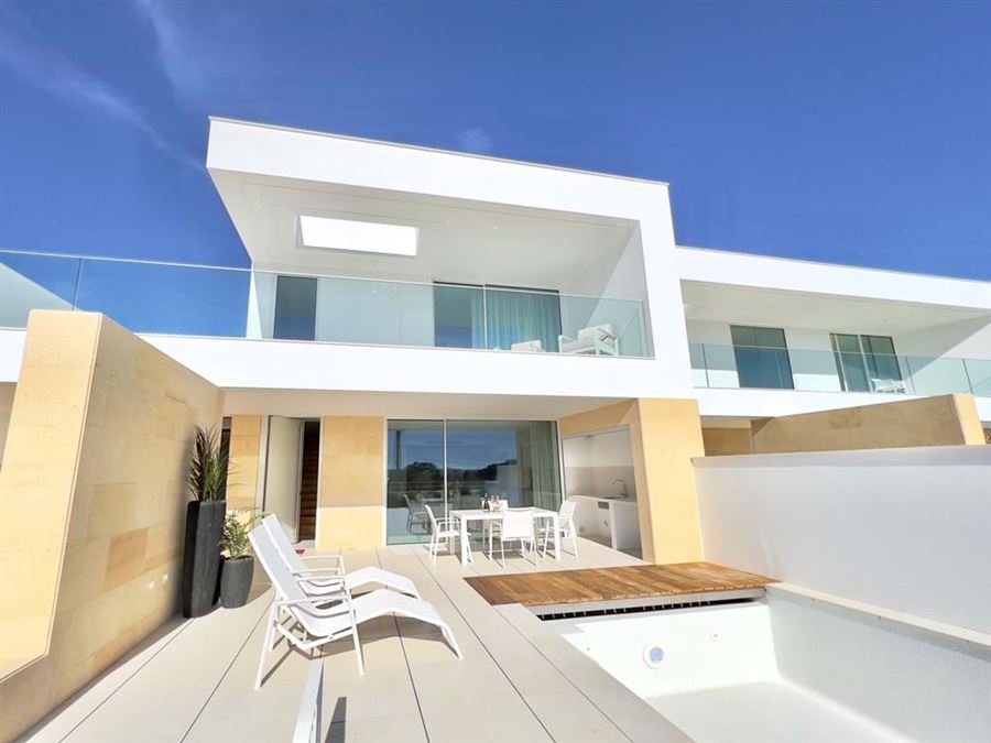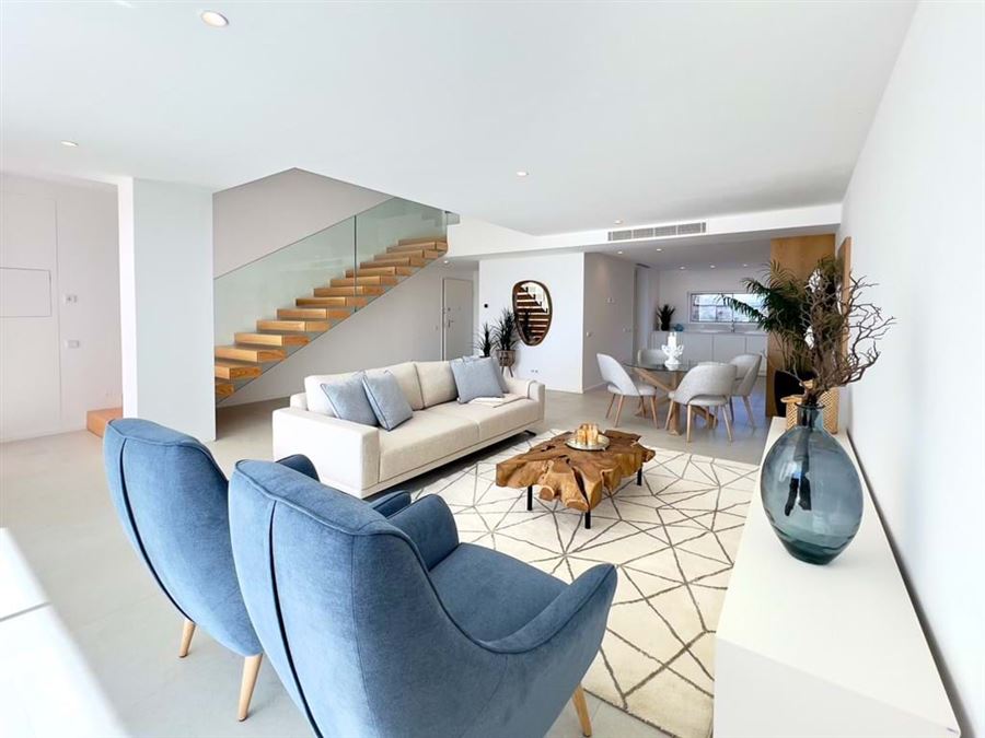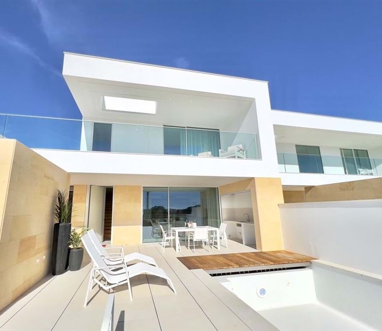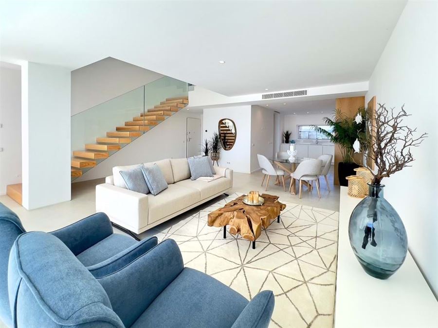Upstairs, there are three bedrooms, including a luxurious suite. The bedrooms share a well-equipped bathroom. A large terrace spans the upper floor, offering stunning views, with glass railings creating a seamless connection between indoor and outdoor spaces.
