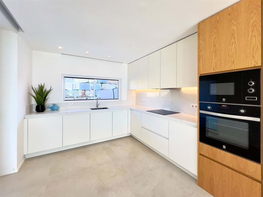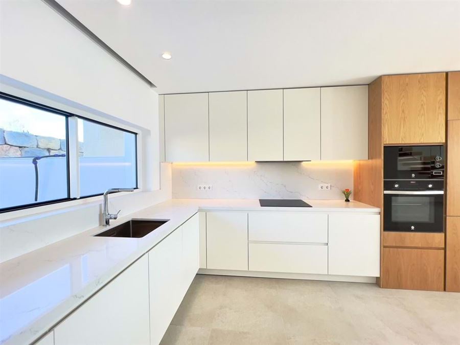 Inside, the splendid open-concept living room seamlessly integrates with the kitchen, highlighted by solid oak wood accents on the stairs. The ground floor includes a guest bathroom, garage access (which can also serve as an office), and a sophisticated kitchen with a Silestone worktop and top-quality finishes. The backyard reveals a technical area and a lush lawned garden.
