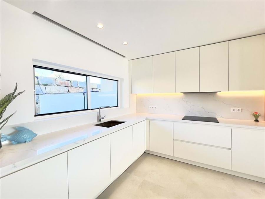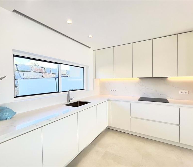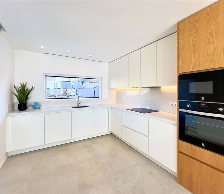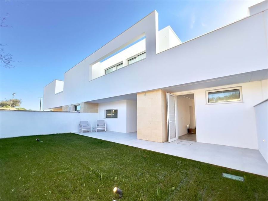 Inside, the splendid open-concept living room seamlessly integrates with the kitchen, highlighted by solid oak wood accents on the stairs. The ground floor includes a guest bathroom, garage access (which can also serve as an office), and a sophisticated kitchen with a Silestone worktop and top-quality finishes. The backyard reveals a technical area and a lush lawned garden.