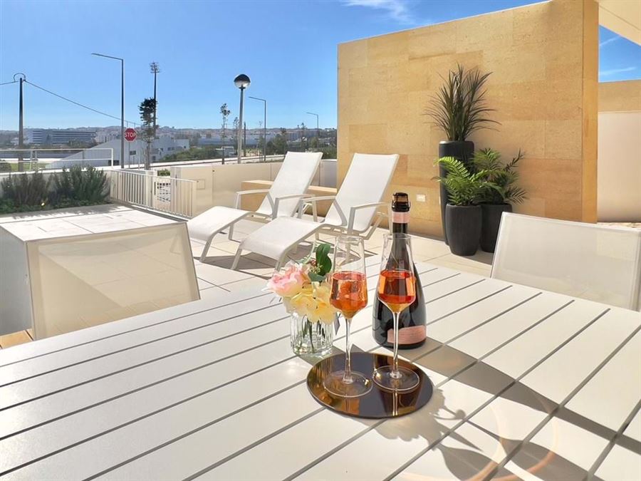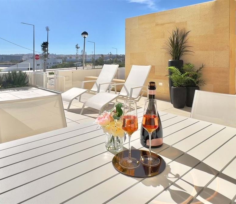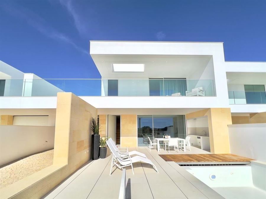 Upstairs, there are three bedrooms, including a luxurious suite. The bedrooms share a well-equipped bathroom. A large terrace spans the upper floor, offering stunning views, with glass railings creating a seamless connection between indoor and outdoor spaces.