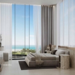 The principal bedroom is a sanctuary with dramatic views of the ocean, complemented by a luxurious en suite bathroom where even the shower overlooks the sea. Throughout the home, high-quality finishes such as aluminum doors and windows with a warm wood finish add style and durability.