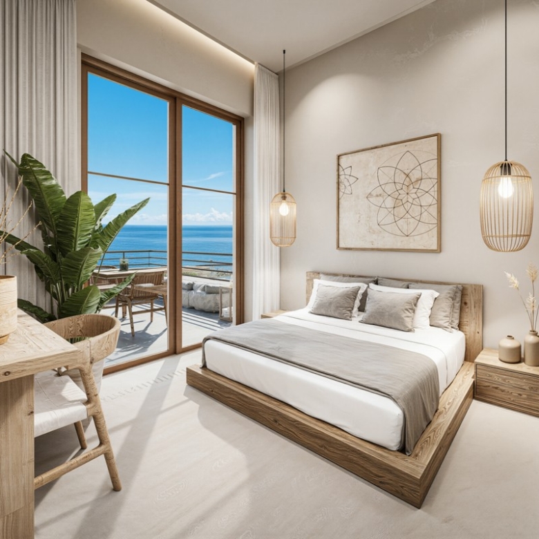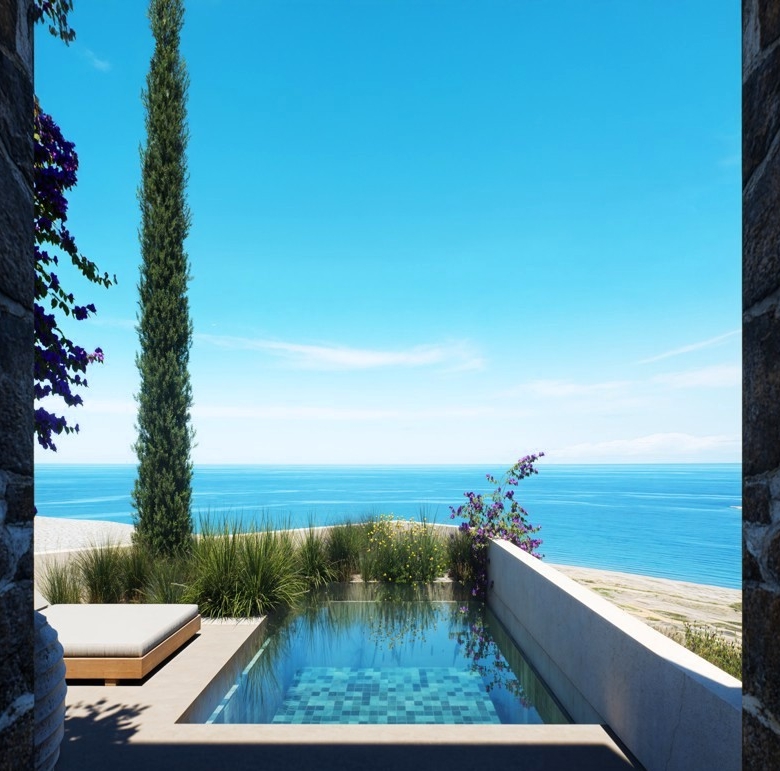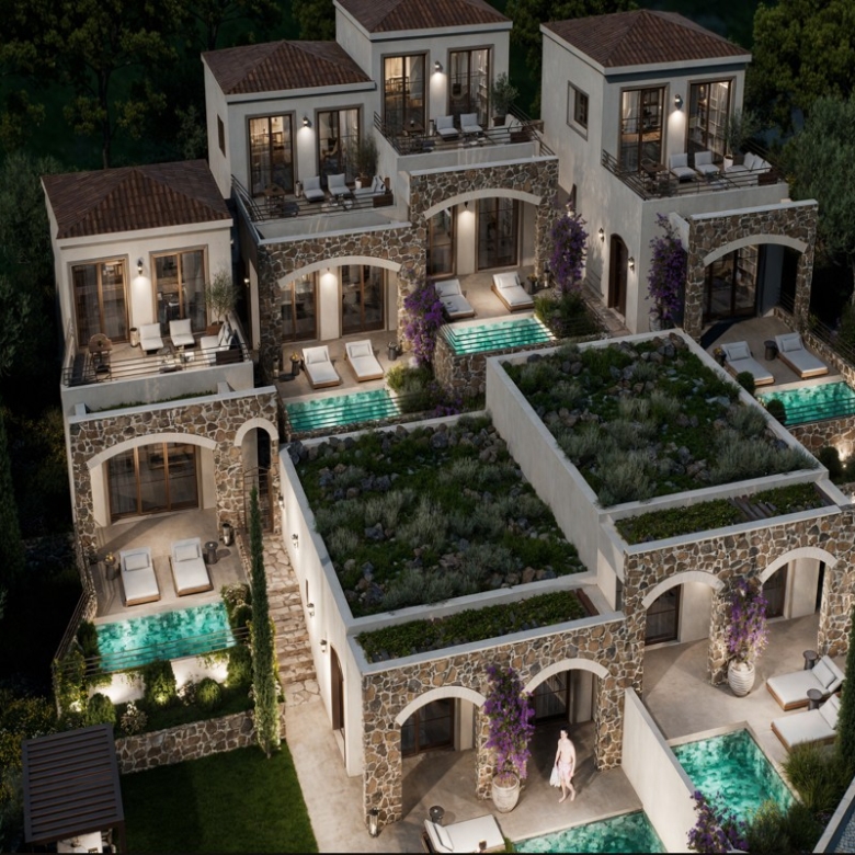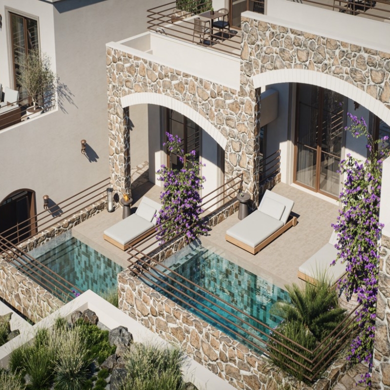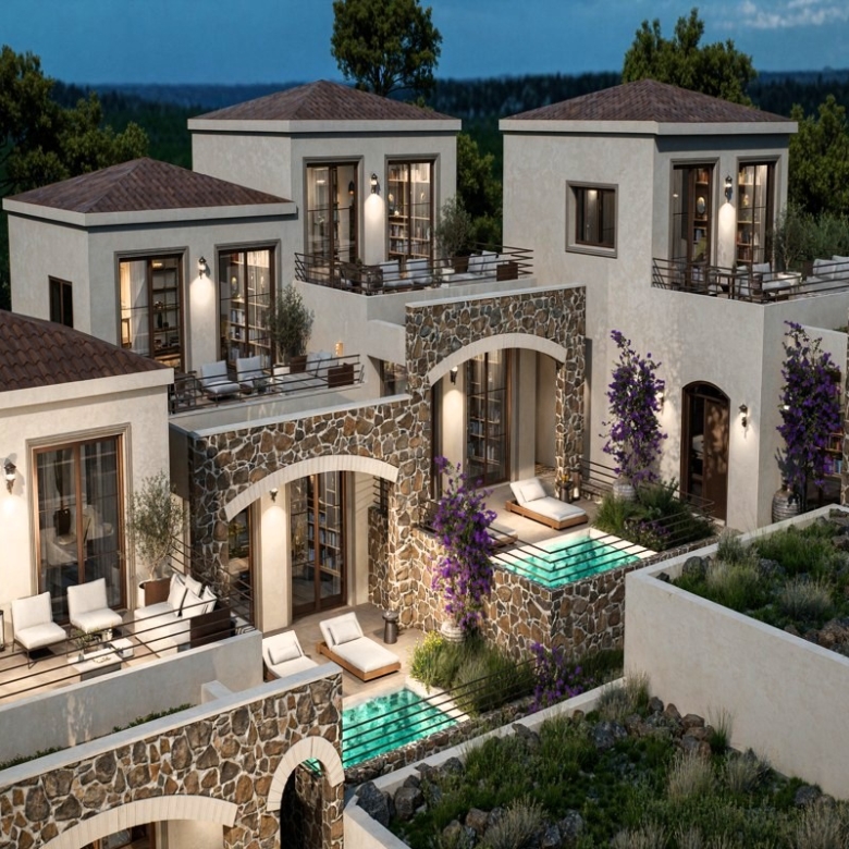 The collection includes two ground-floor villas and four maisonettes, offering a variety of layouts to suit different lifestyles. Each villa features two bedrooms and two bathrooms, including one ensuite, with an open-plan living, dining, and kitchen area that flows directly onto terraces and outdoor sitting areas, connecting indoor and outdoor living. Every property also includes a private swimming pool, landscaped garden, and private parking, creating a complete, functional home.