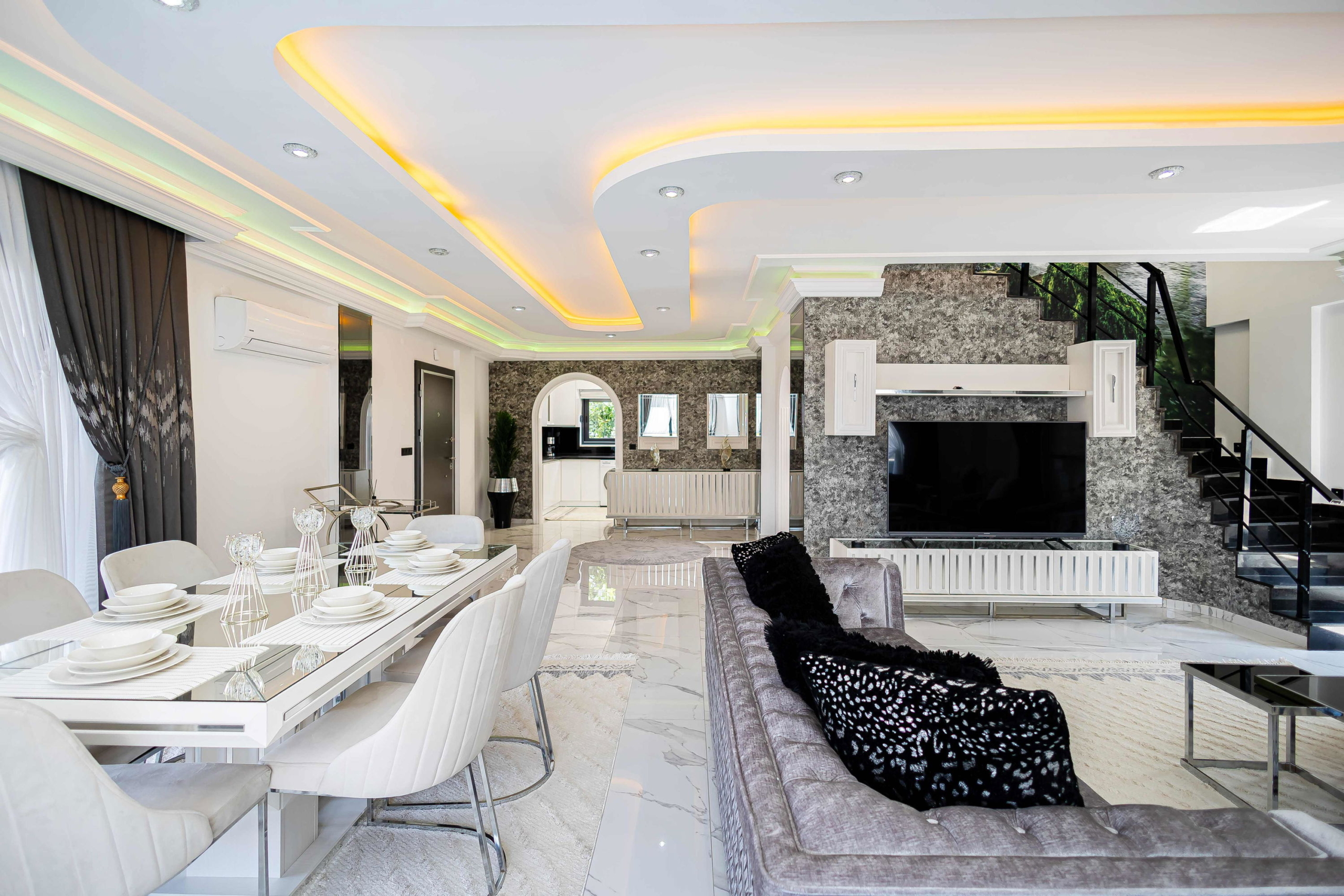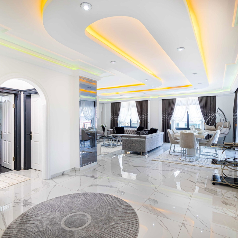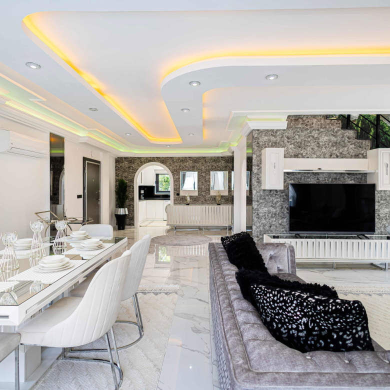 The expansiveliving roomincludes high-gloss marble-look floors, layered lighting from spotlights and LED strips, and a modern ceiling design. Furnished with contemporary sofas, a glass coffee table, and an elegant dining set, the space blends comfort and sophistication effortlessly.