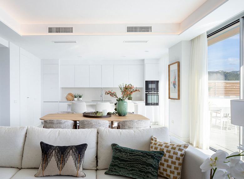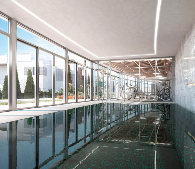 With various property types and orientations, the development includes ground-floor units with expansive terraces and gardens, as well as penthouses with panoramic views of the golf course and natural surroundings. Modern, open-plan layouts merge living and kitchen spaces, enhanced by large-format porcelain tiles, floor-to-ceiling windows, and integrated LED lighting. Landscaped gardens with mature pine trees provide privacy, while on-site leisure and sports facilities support a balanced, healthy lifestyle in a peaceful, natural environment.