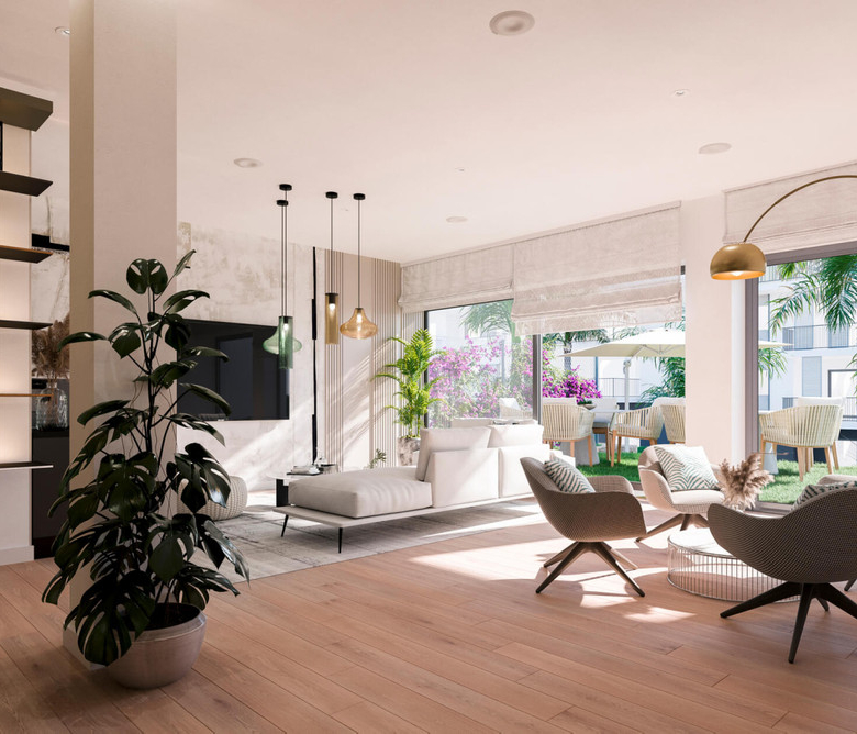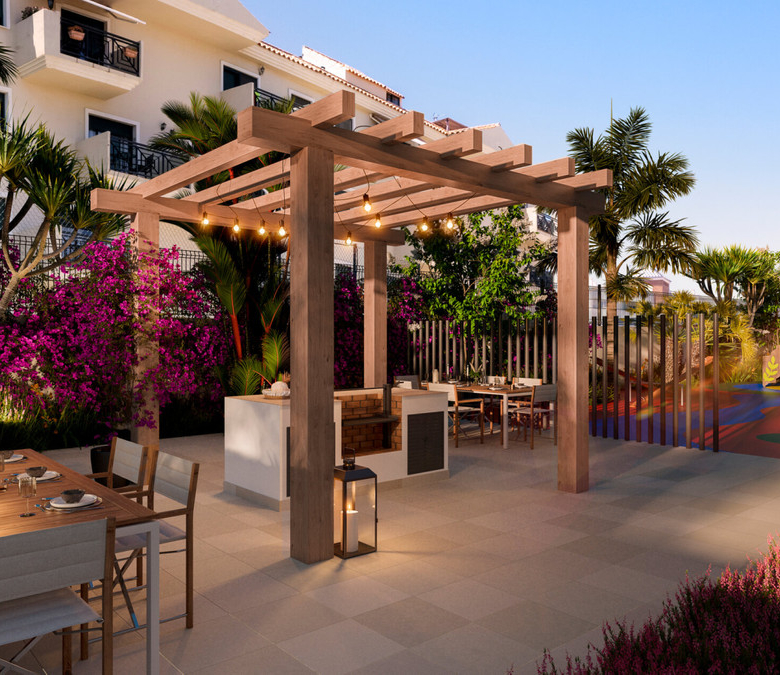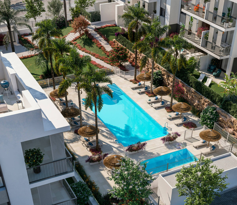 This development consists of 102 apartments and penthouses of 1, 2 and 3 bedrooms, with constructed areas of up to 102.75 m2, terraces of up to 97.36 m2 and gardens on the ground floor of up to 52.03 m2. It is a residential complex with the highest standards of architecture, energy saving and sustainability, which also has privileged common areas such as its gardens, its two swimming pools, the children's play area, the barbecue area or the coworking space. All units include underground parking and some of the units will also have a storage room.