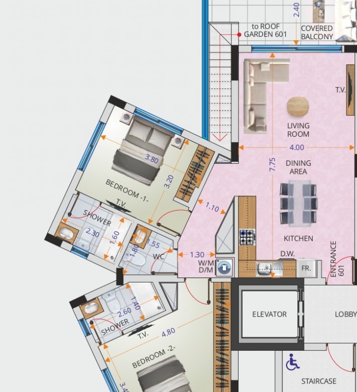 The project will compose of twenty spacious apartments. At the first and second floor will be six apartments of one bedroom and one apartment with 2 bedrooms. From third to sixth floor will be three apartments with 2 bedrooms and 2 bathrooms. The three sixth floor apartment’s of the project will have a private and luxurious penthouses on the seventh floor, with α magical panoramic south-east view of the City of Larnaca just 200 meters from the sea. All energy efficient luxury apartments are designed to have large living areas and balconies along with large bedrooms including en –suite shower rooms and walk-in wardrobes. For those who prefer the top end of luxury they can select to purchase a three bedroom penthouse plus a room on the roof-garden with special features which boast luxury living to its limits. This unit has a roof garden of 68 square meters with an extra room.