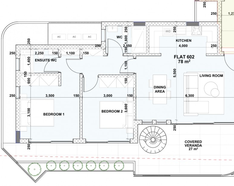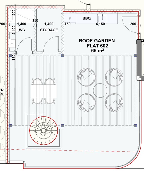 The project boasts sixteen apartments two bedroom & two bathroom apartments – all with spacious and contemporary living areas. There are two apartments per storey – ensuring optimum privacy for potential buyers. The eight floor apartments benefit from individual private and luxury roof-gardens with amazing views of the lovely Neighborhood. Each apartment has one parking bay and a storage room on the ground level. This unit has a roof garden of 54 square meters with 2 rooms and a bathroom.