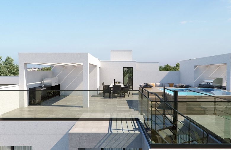 An impressive residential complex of Infinity is located in one of the most upcoming residential areas of Larnaka – Oroklini. Placed right next to the tourist area of Oroklini, close to the beach, luxury hotels, restaurants, and cafes. It will consist of 1-, 2-, and 3-bedroom apartments and penthouses, with spacious verandas, which promise their residents moments of relaxation and comfort. This beautiful complex has a swimming pool exclusively for the owners. This unit has a roof garden of 90 square meters, which is uncovered.