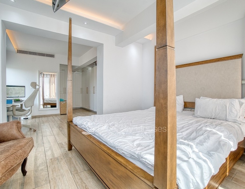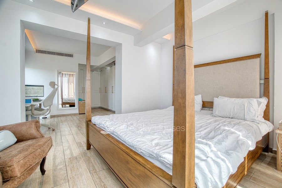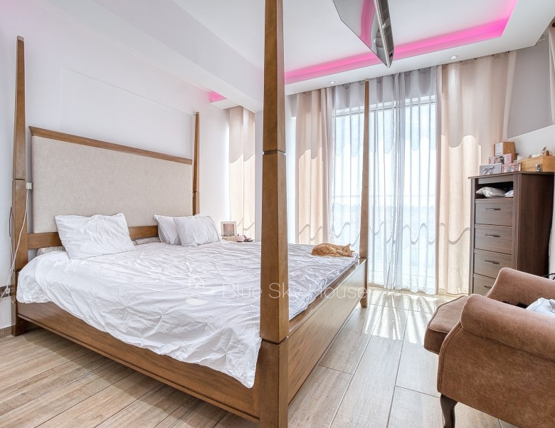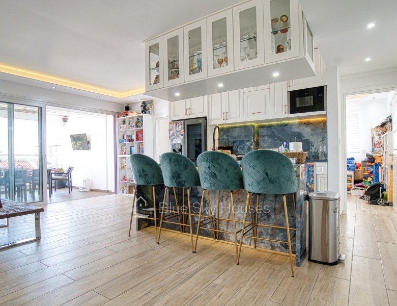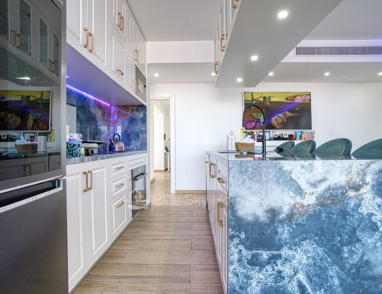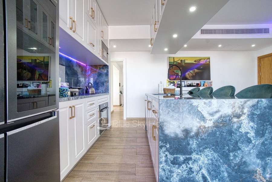Designed with attention to detail, all three bedrooms are ensuite, with the master suite spanning an impressive 28sqm, complete with a walk-in wardrobe. The apartment boasts a custom-made interior with a VRV system, smart home system, LED lighting, wooden kitchen featuring top-of-the-line appliances. Stylish, high-quality furniture, all just one year old, enhances the contemporary and sophisticated atmosphere.