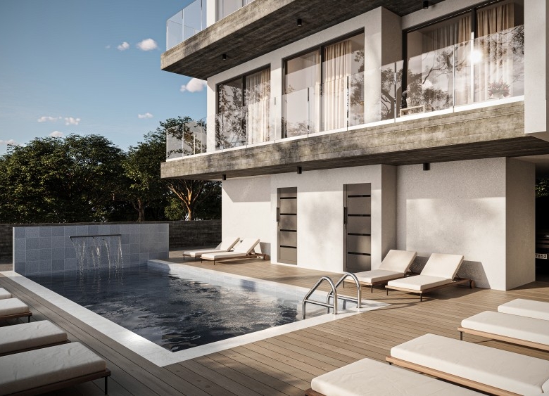 An exceptional block of high-end apartments located in the beautiful town of Universal, Paphos. The exclusive complex features three stories of luxury living, with each floor comprising spacious and elegant two-bedroom apartments.  The apartments have been designed with contemporary style and luxury in mind. The living spaces are open and inviting, with high-end finishes throughout, including beautiful Italian tiles and modern light fixtures. The bedrooms are bright and airy, with large windows that allow plenty of natural light to flood in, creating a relaxing and comfortable environment. The ground floor of the complex boasts a beautiful poolside area with communal changing rooms, storage spaces, and parking spaces. Offering a lifestyle of luxury and comfort, with underfloor heating providing ultimate comfort throughout the year. The kitchens come fully equipped with modern appliances and high-quality counters, creating the perfect space for culinary exploration. This unit has a roof garden area of 114 square meters.