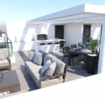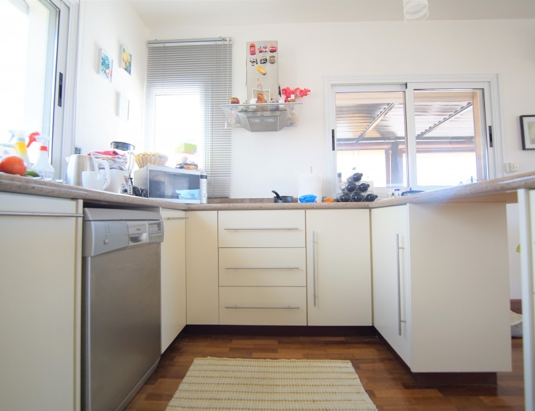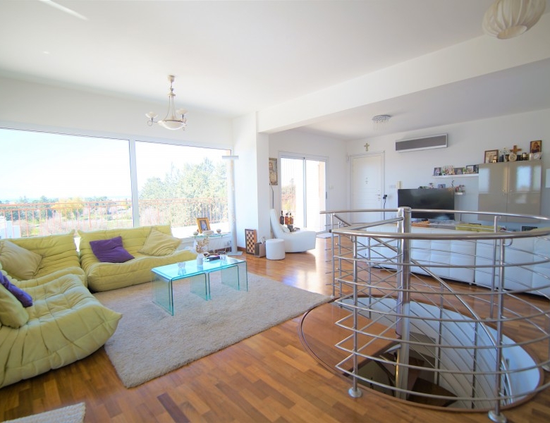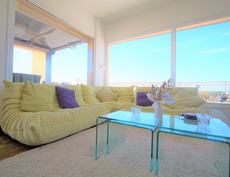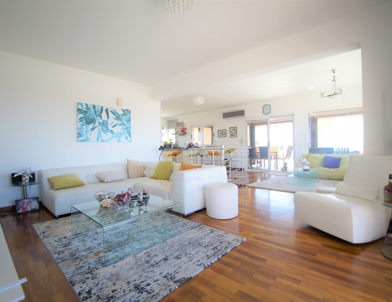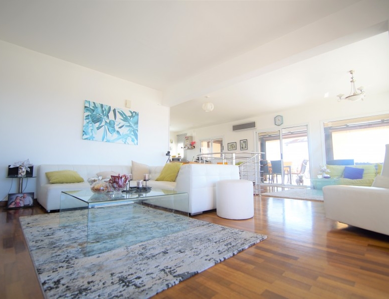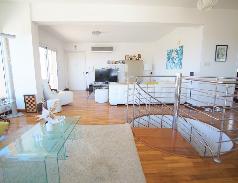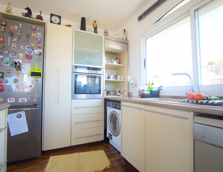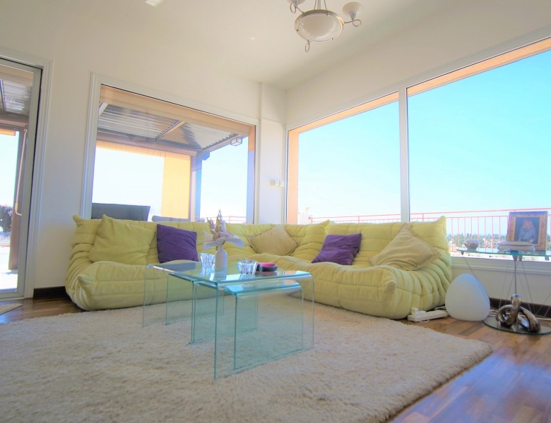 The complex itself is closed and consists of 8 blocks, forming a symmetrical harmonious U-shaped structure. In the center of the complex is a large swimming pool. On a large area of the plot, in addition to the pool, there is a spacious recreation area with a playground and an orchard. In one of the blocks, this homely cozy penthouse with direct sea views is located. The apartment consists of 2 levels. The main upper level features a spacious bright living room, dining area, and open plan fitted kitchen. Also on this level of the apartment, there is one double bedroom. From this level, you enter through the patio doors to a huge veranda with a seating area and BBQ area. The veranda is very large, which can serve as additional ideas for the implementation of various ideas, such as installing a jacuzzi or a small gym. On the lower level of the penthouse, you will find 2 large bedrooms with their own bathrooms. The apartment is renovated and equipped with everything necessary for permanent living, namely, household appliances, air conditioning and 6kv photovoltaic batteries, CCTV cameras, and private covered parking.