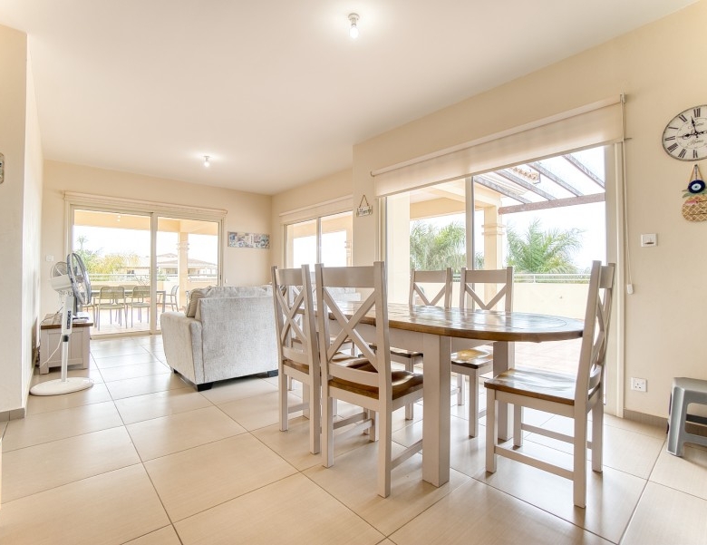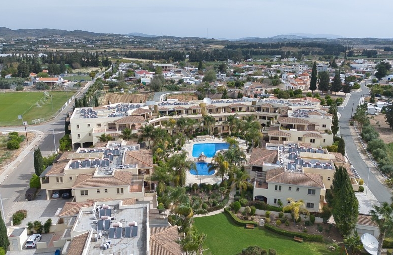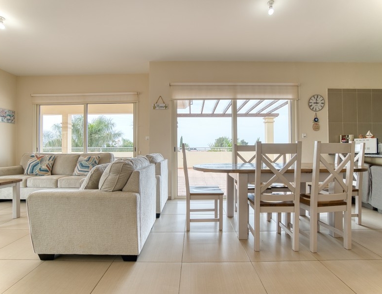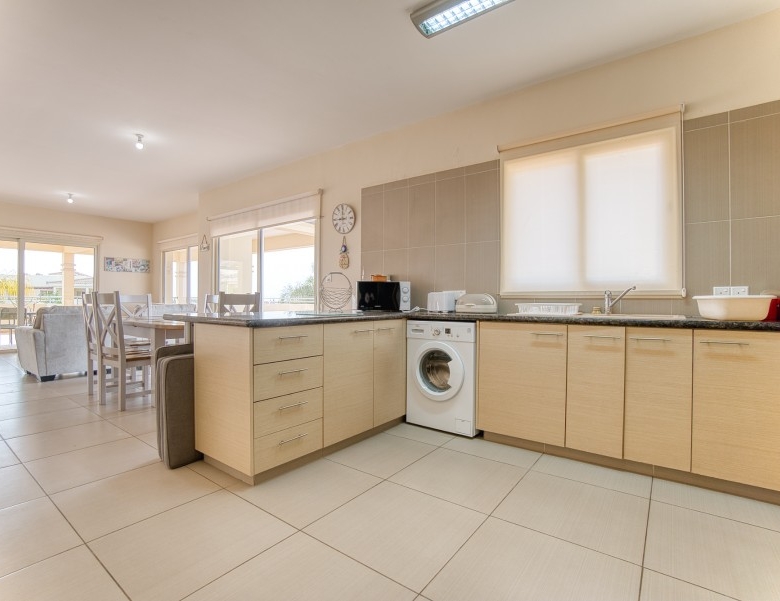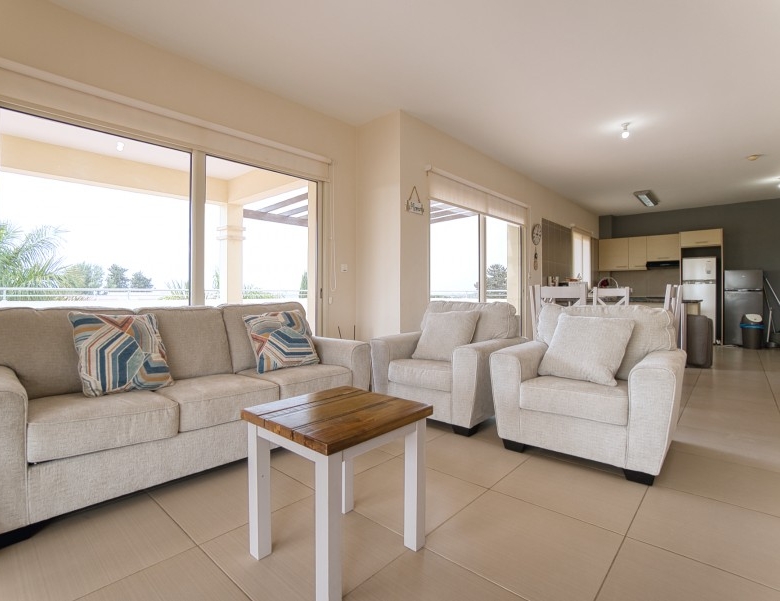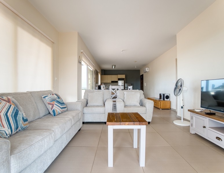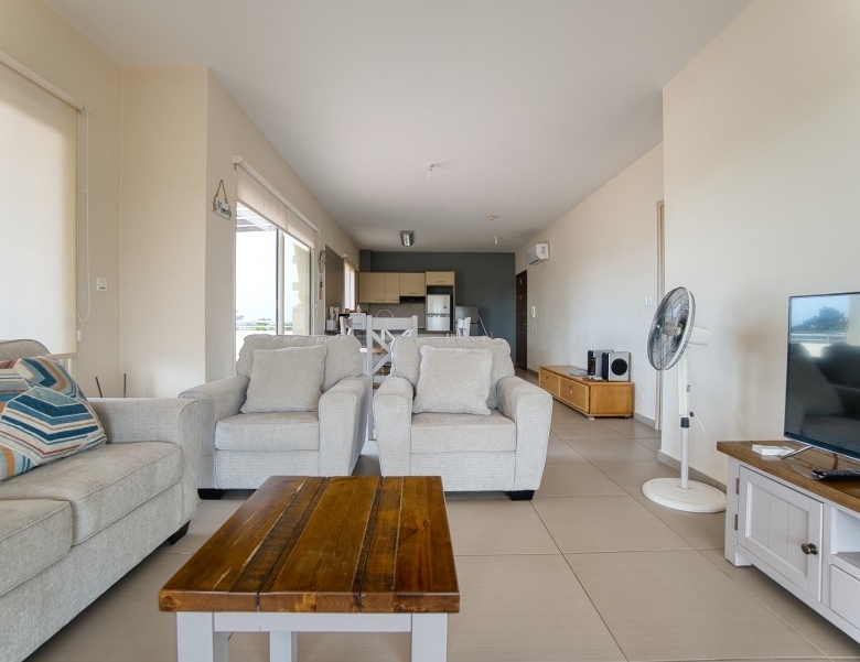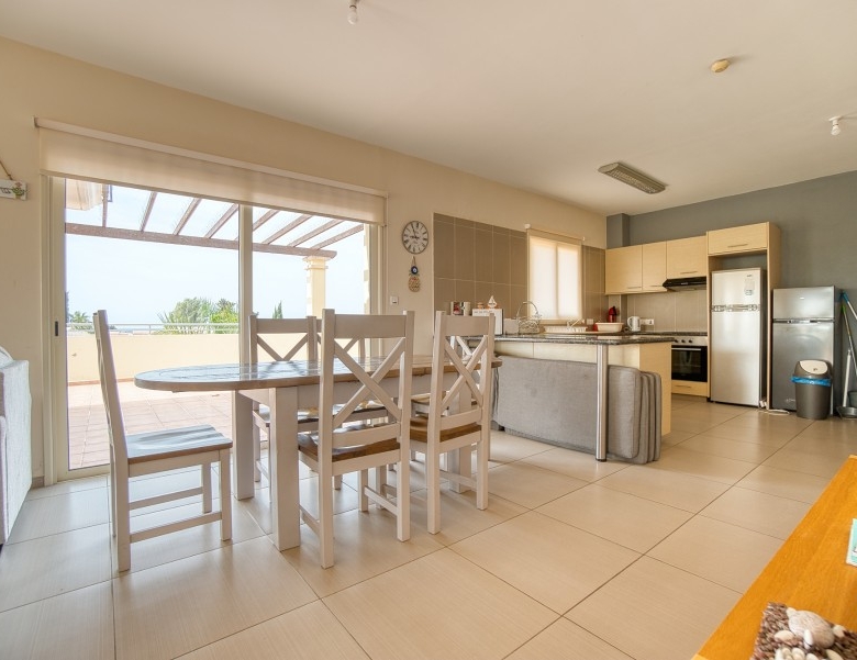 The penthouse has sea views from the kitchen, dining and lounge areas. There are views over looking the pool areas too. The development is a short walk (less than 5 minutes) into the center of the village, which has several restaurants, pubs and a mini-market. The development is a short drive (5 min) to Paphos airport; and 5-10 minutes to three of the top golf courses on the island. It is less than a mile to the beach, approximately 15 minute walk.