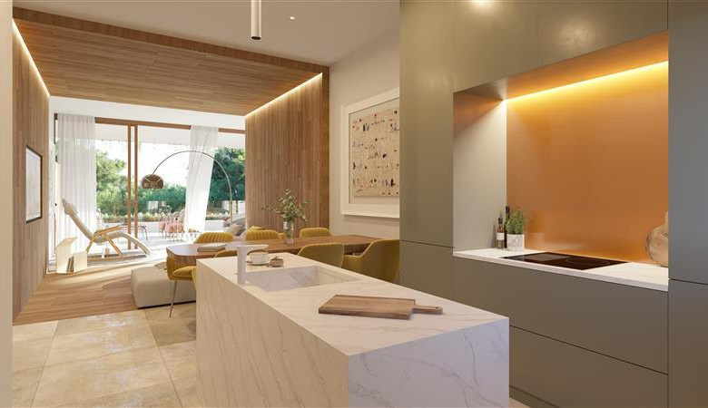 The living room and bedrooms have large windows letting in natural light, merging with the wooden that features within the interiors. The Italian kitchen is characterized by a long island of marble carefully connecting with the warmth of the design. The outdoor terrace brings in Mediterranean fragrances, as the interior and exterior blend together becoming one. Every corner of your home will have a scent specially chosen by you.