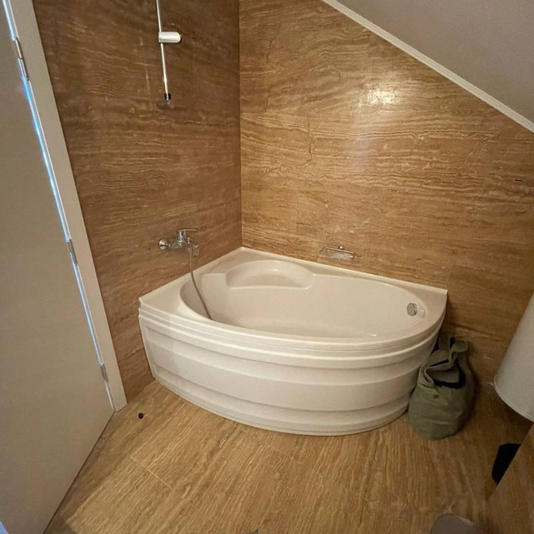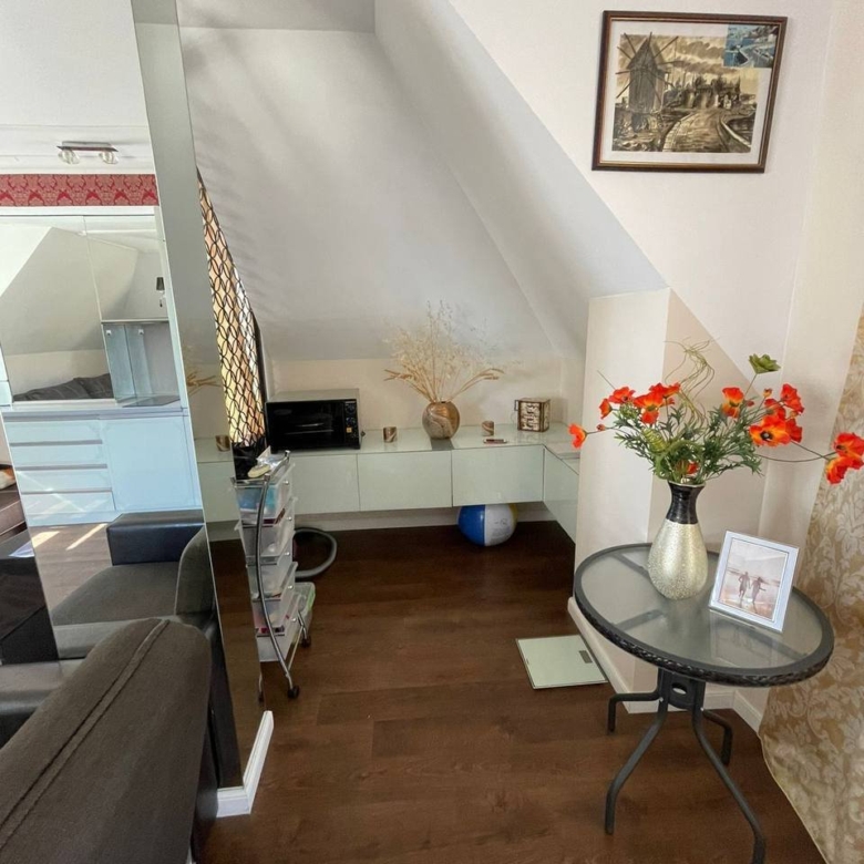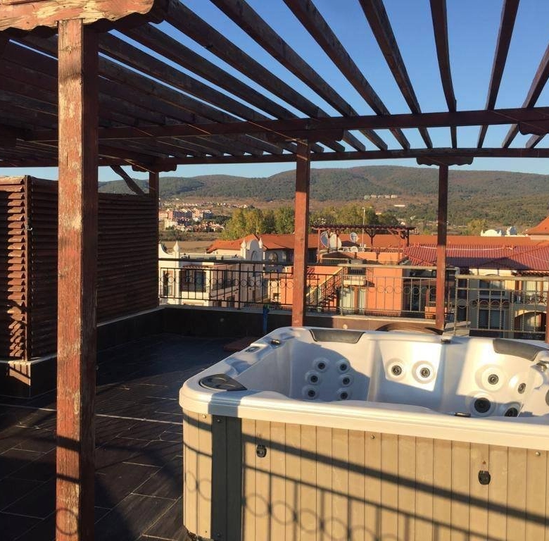 The apartment is fitted with a jacuzzi on the roof, stairs, a lot of storage space, a bedroom with a wardrobe, a large balcony, and a living room fitted with sofas, a large TV, a dining area, garden stools, and chairs on the roof, and much more.