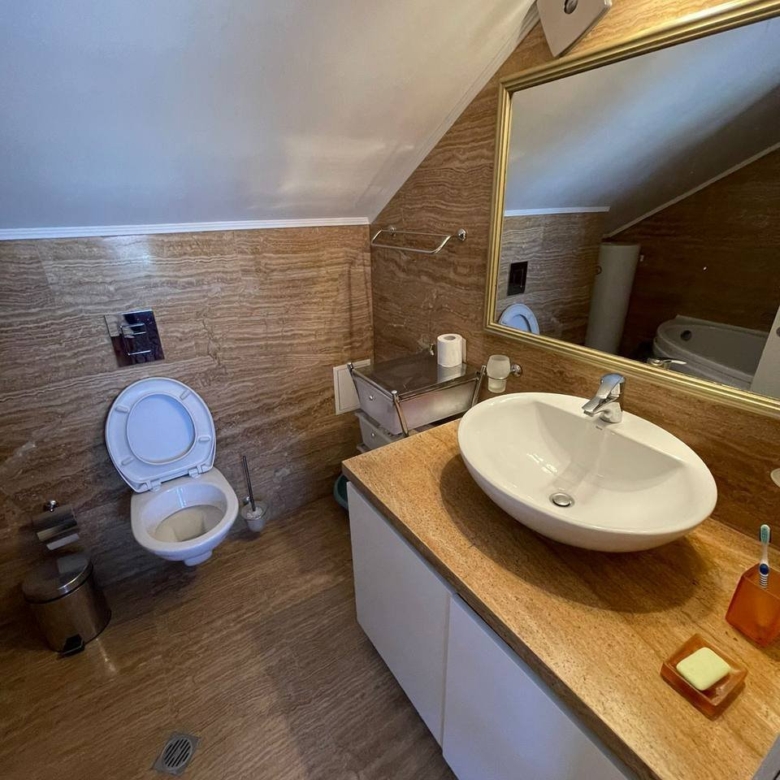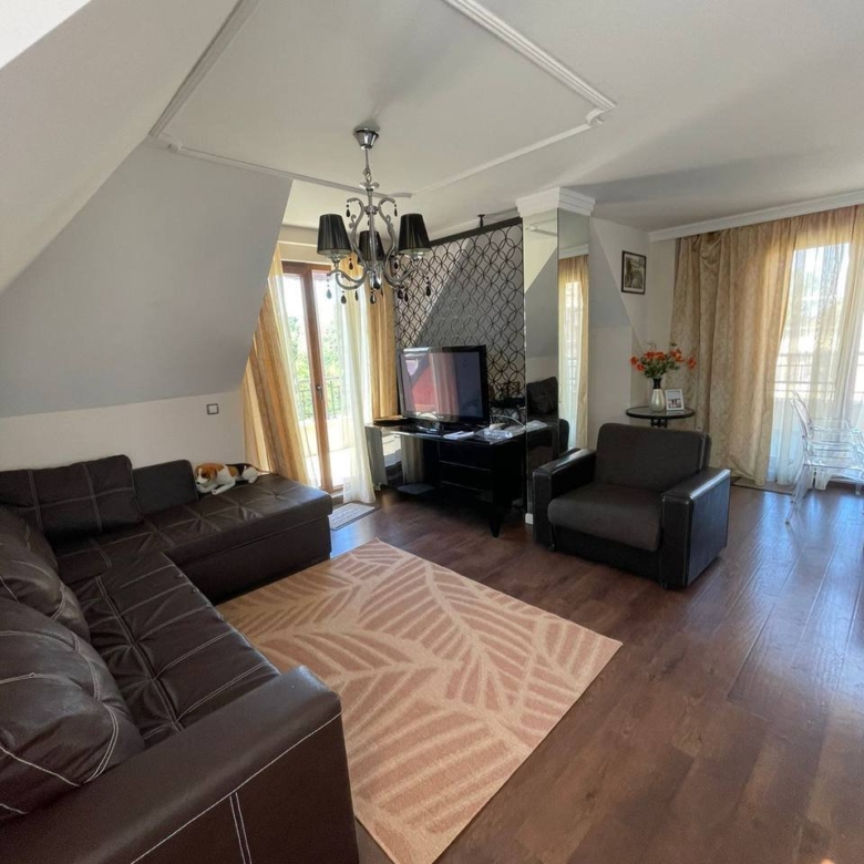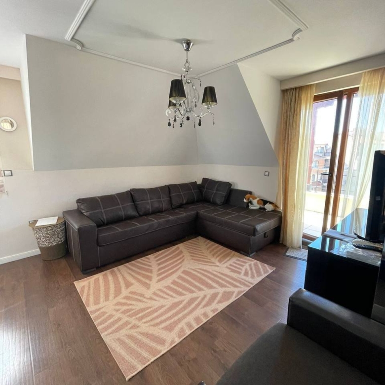 The penthouse includes terrace furniture consisting of chairs and a table, as well as decorative interior elements. It is equipped with sofas, a dining table with chairs, a TV, a spacious kitchen, a wardrobe, and a king-size bed in the bedroom. All furniture remains in place, and the penthouse is fully equipped.