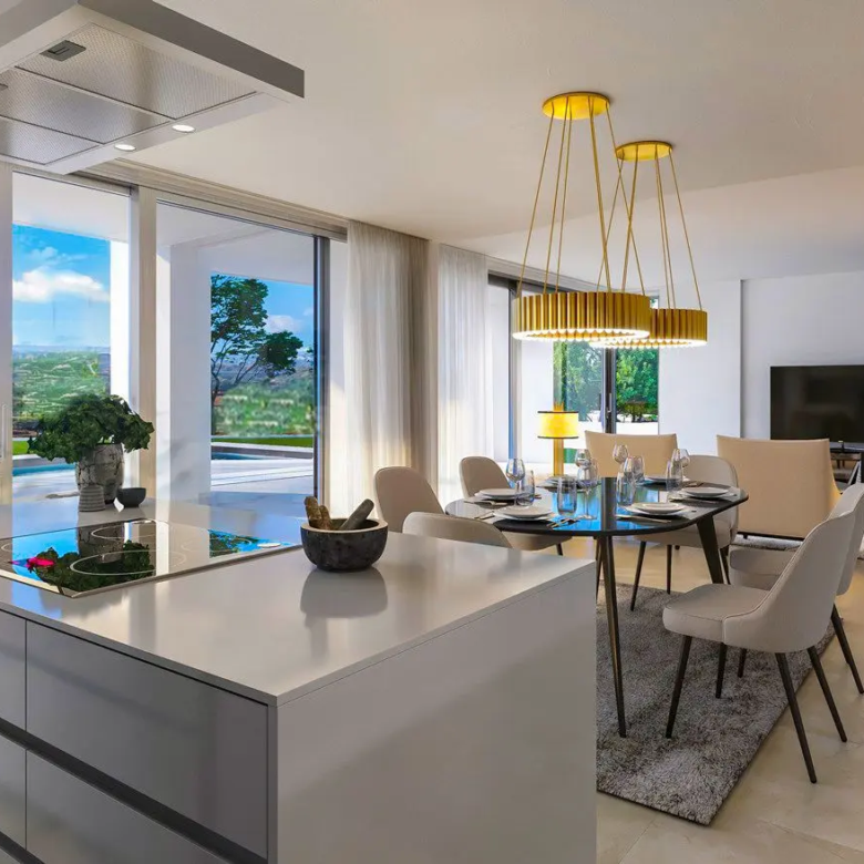 Each villa is meticulously designed with large, bright rooms that provide stunning views through grand windows, offering a serene and spacious ambiance. The luxurious bathrooms are equipped with modern fixtures, while the living and dining areas are crafted for utmost comfort and functionality. The kitchen boasts the latest technology and an open-plan design, making it a delight for culinary enthusiasts.